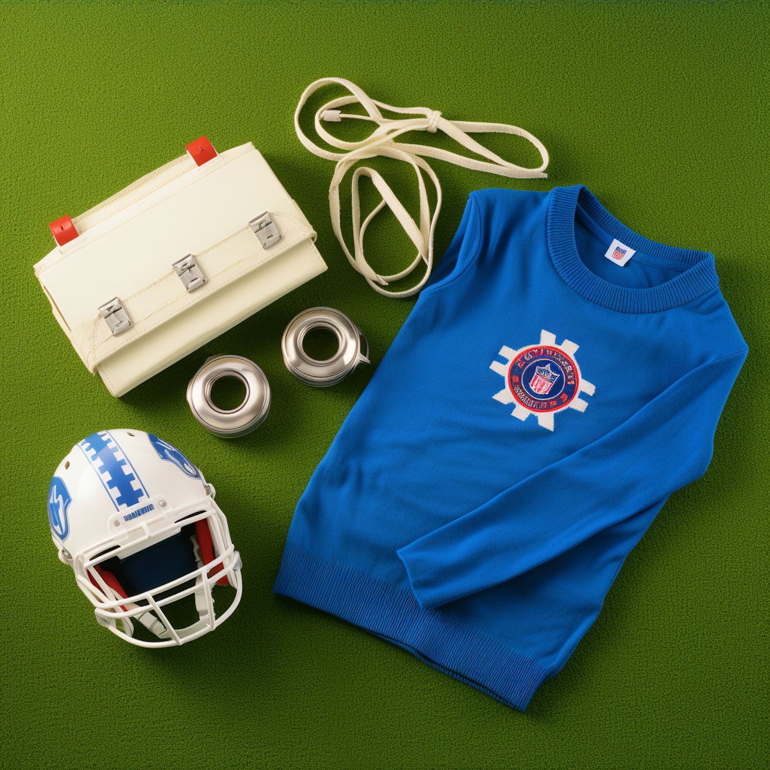 Sports gear on green: blue sweater, white helmet, medical kit, silver canisters, and rope. Perfect for football enthusiasts.