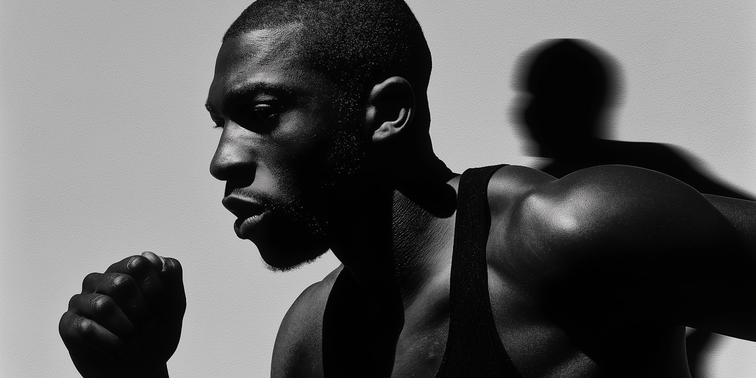 Striking black and white portrait of an athletic individual in motion with dramatic lighting emphasizing physical intensity.