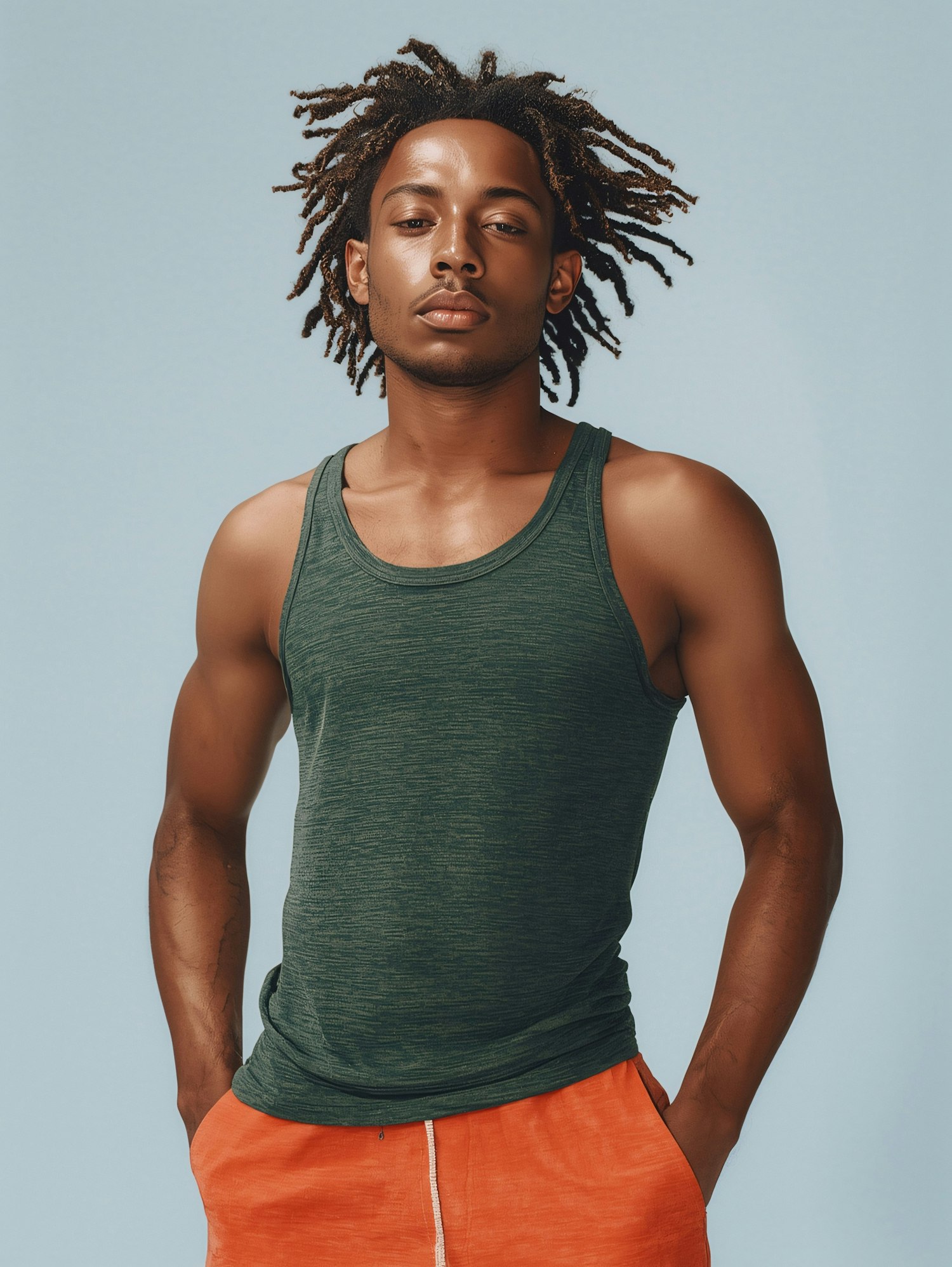 Stylish young man with dreadlocks in a green tank top and orange shorts, posing confidently against a light blue background.