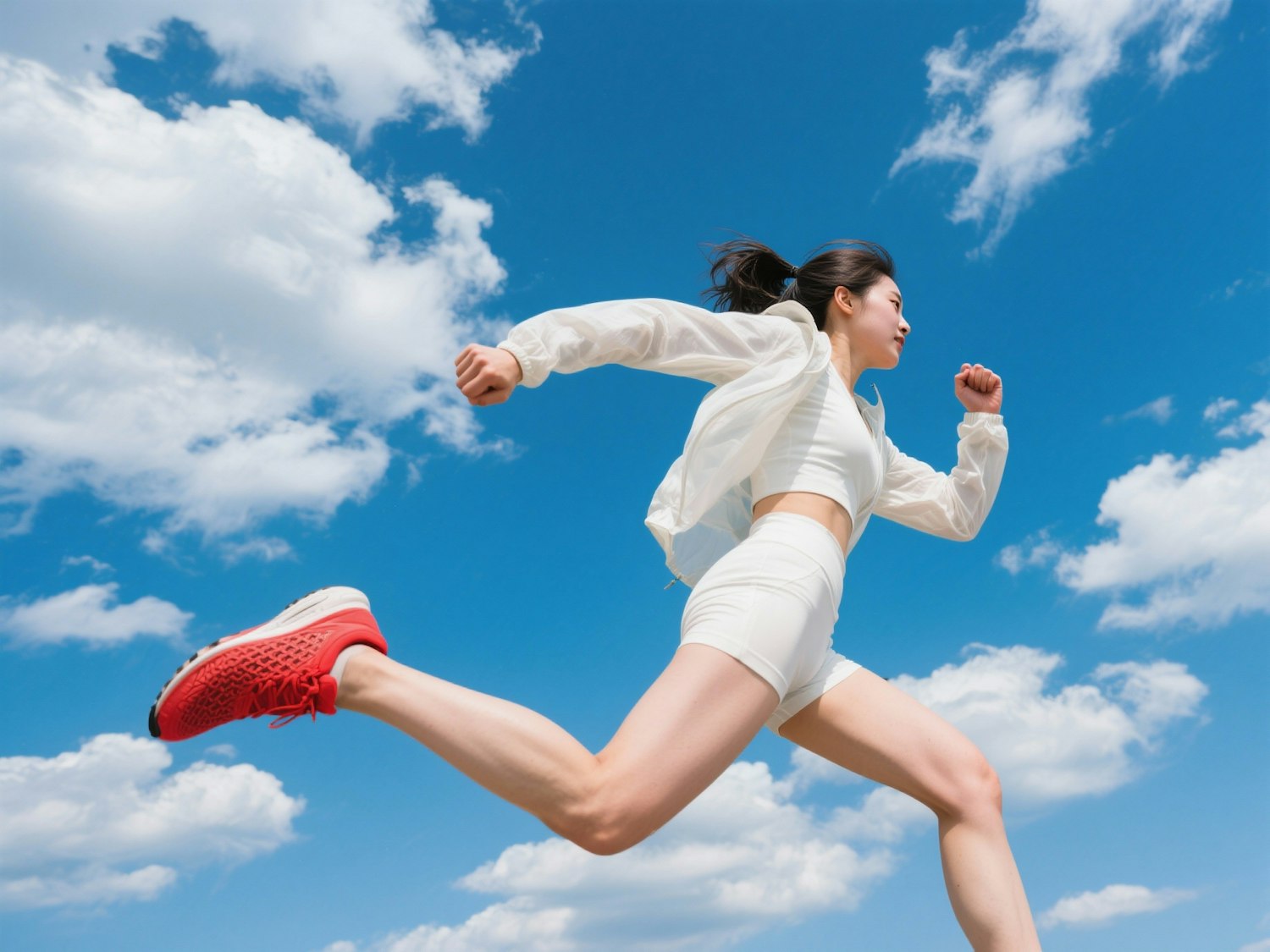 A woman in white athletic wear and red shoes runs dynamically against a bright blue sky with clouds, showcasing energy and movement.