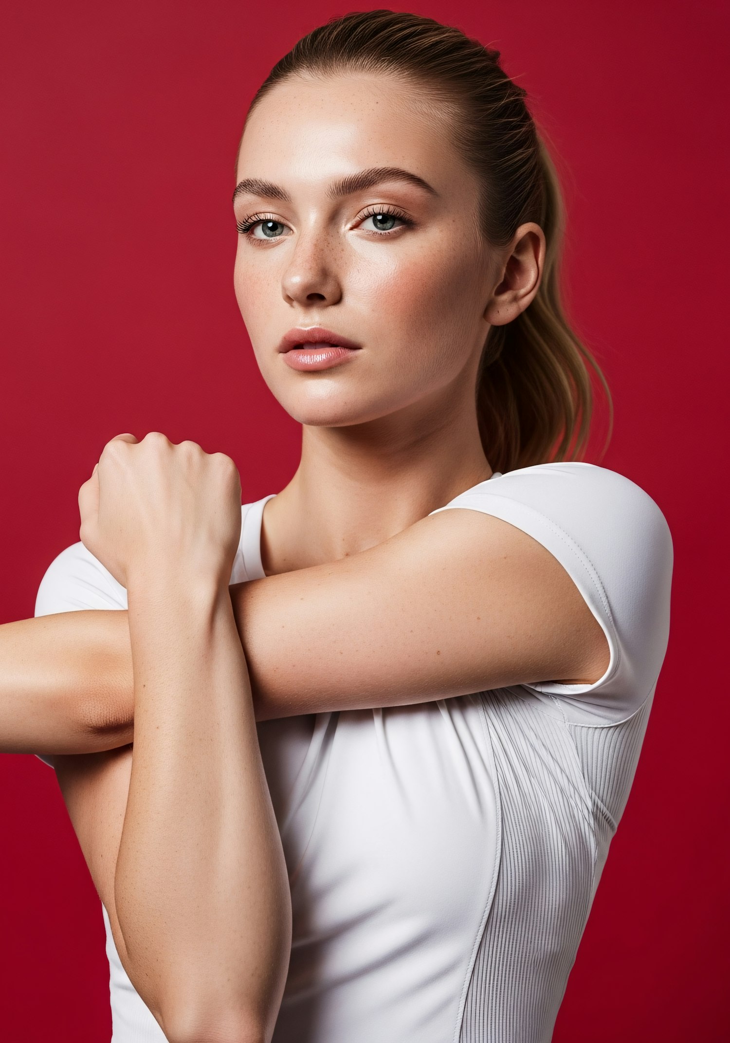 A young woman in a white athletic top stretches her arm against a red background, showcasing a fitness or wellness theme.