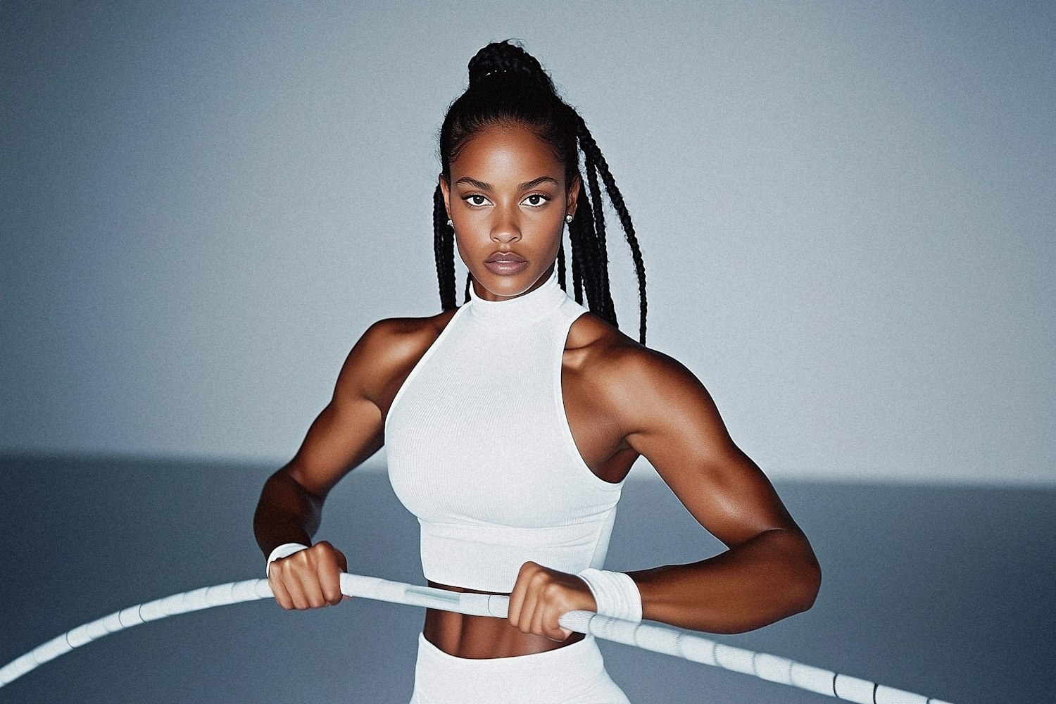 Athletic Black woman with braided hair in a white crop top holding a rope, showcasing strength and focus.