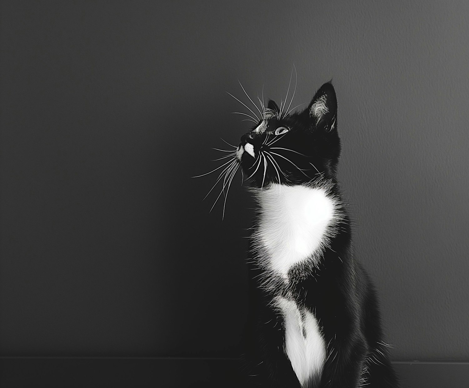Elegant black-and-white tuxedo cat gazing upward with curiosity, set against a minimalist dark gray background.