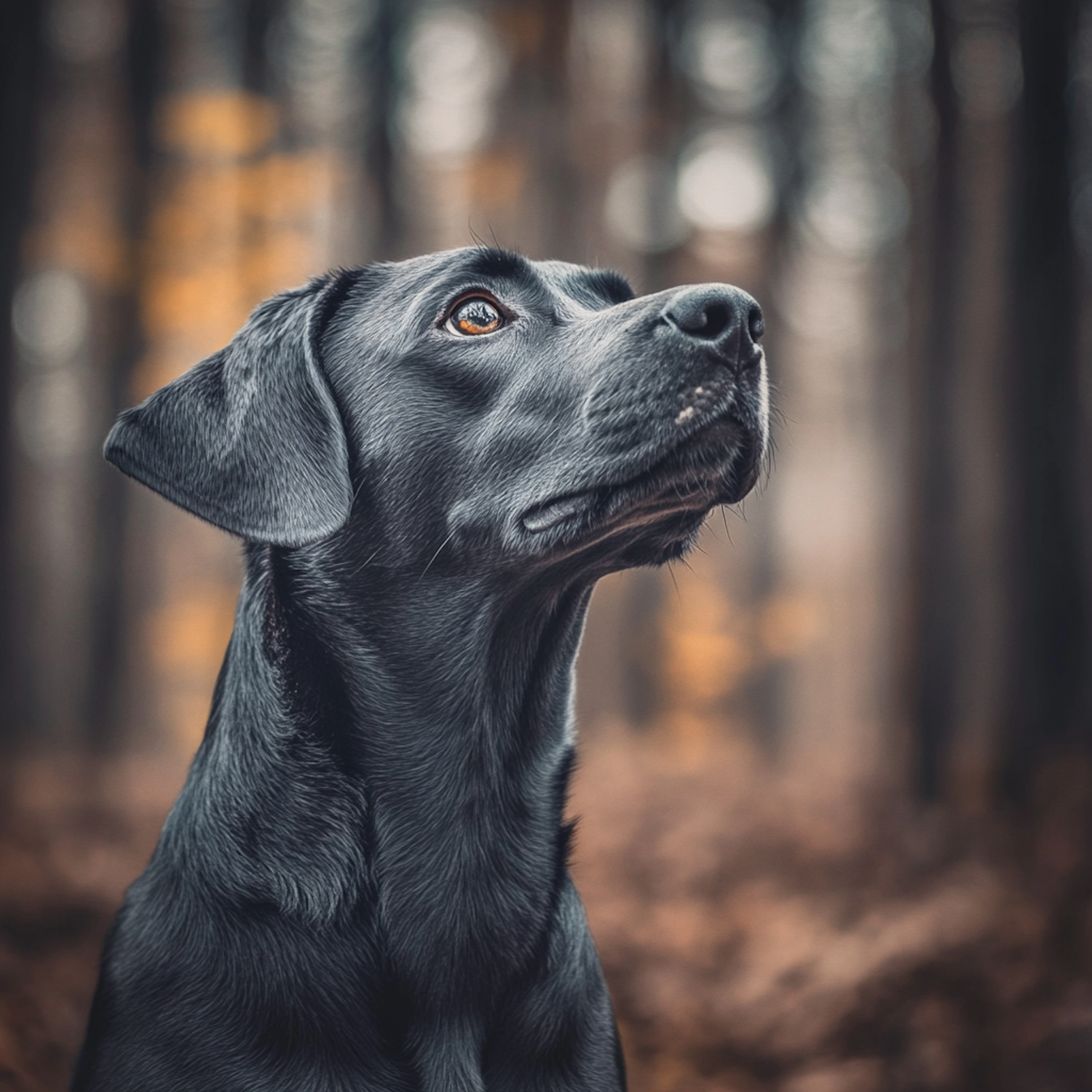 Black Labrador Retriever in a forest, gazing upward with a focused expression. Autumn colors create a serene background.