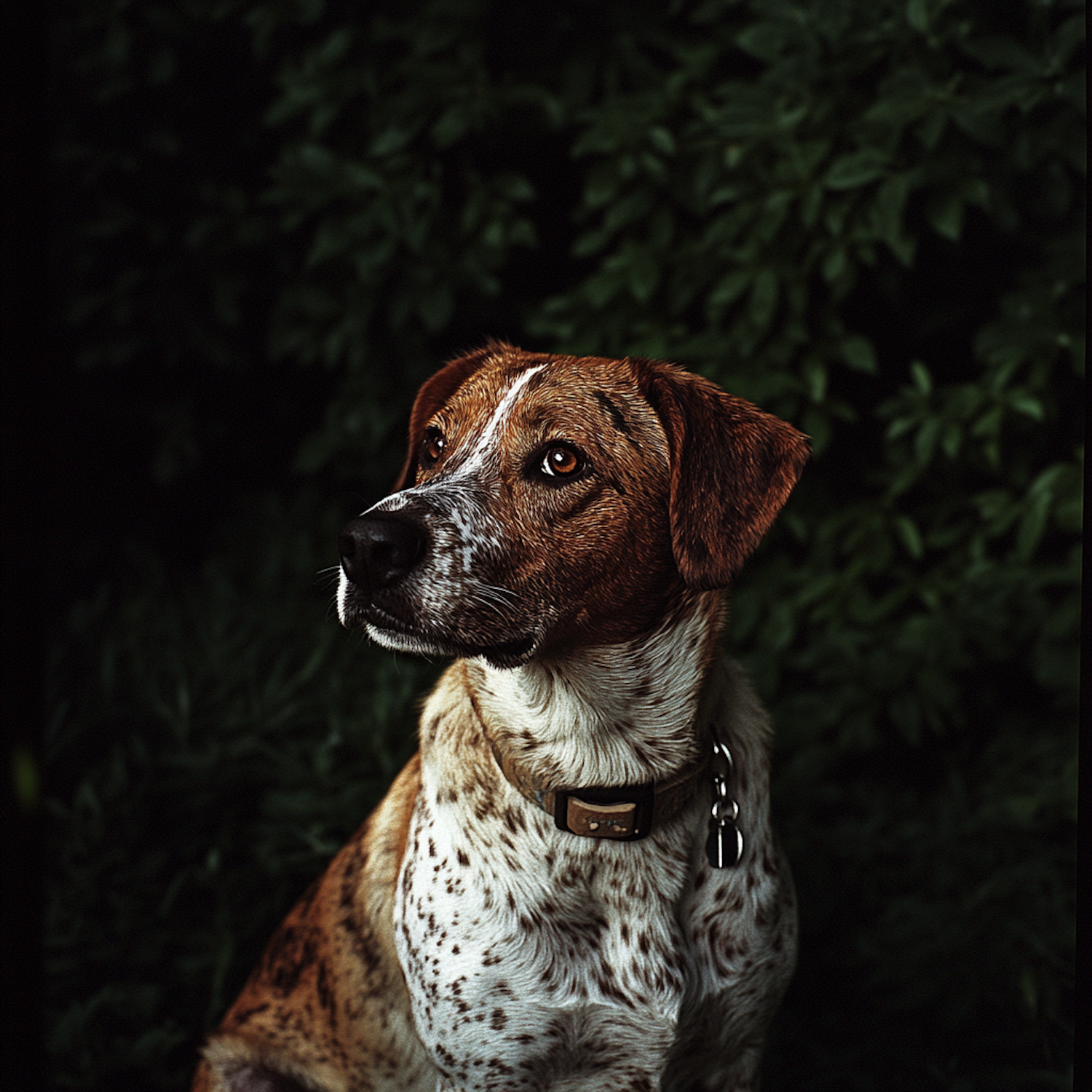 A brown and white speckled dog sits attentively against a lush green background, wearing a collar with a metal tag.