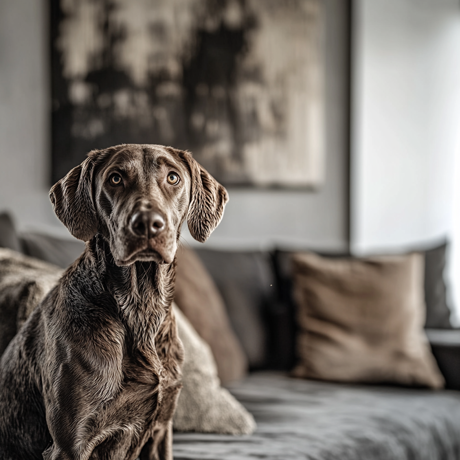 Brown dog sitting on a gray sofa with earth-toned pillows and a blurred abstract painting in the background.