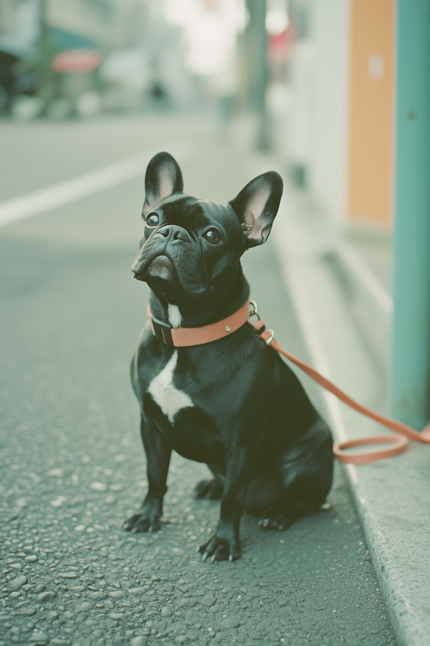 Adorable black French Bulldog with orange collar sits on a city sidewalk, looking alert and curious.