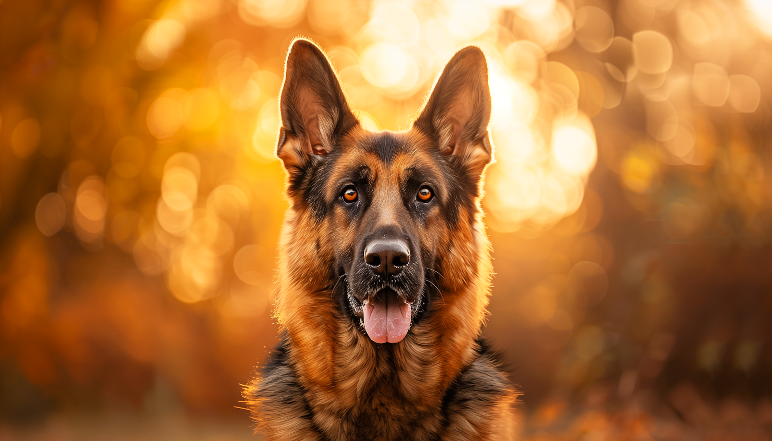 German Shepherd in warm autumn light with a bokeh background, showcasing its alert expression and rich black and tan coat.