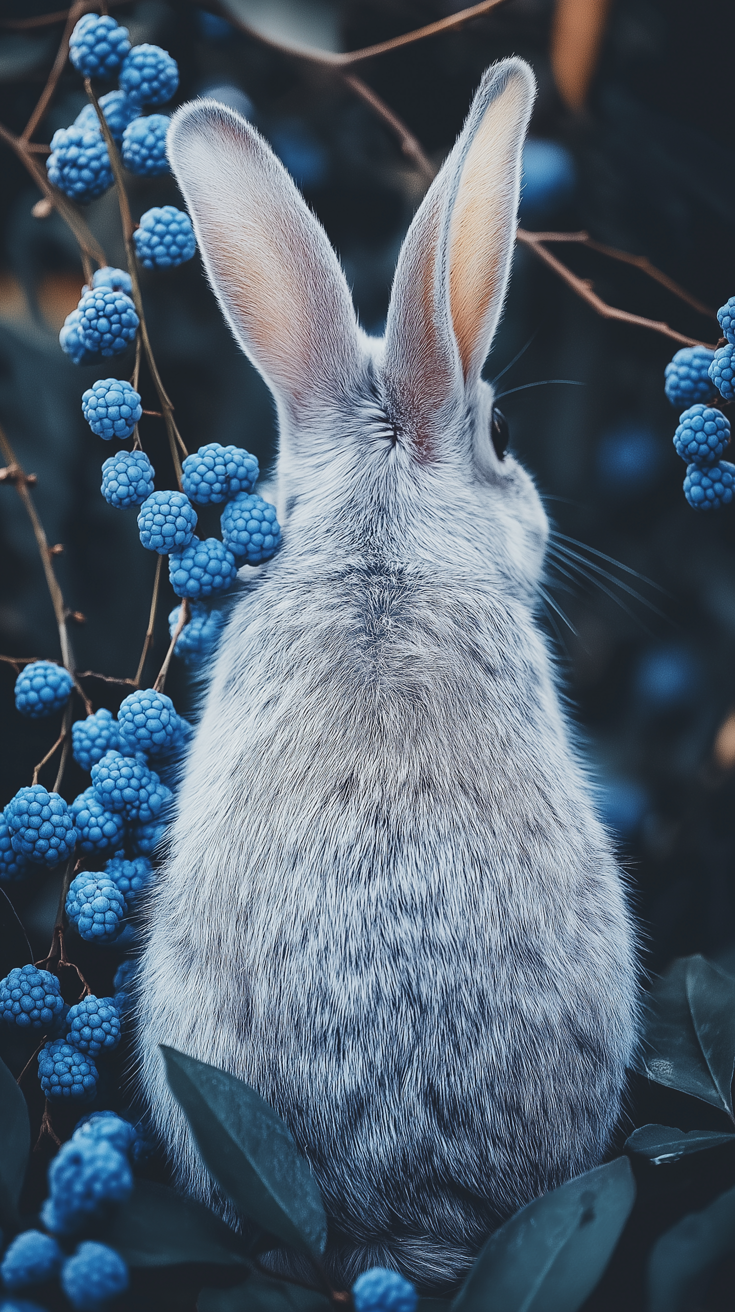 A serene rabbit with gray fur sits among vibrant blue berries, creating a striking contrast in this intimate and detailed nature scene.