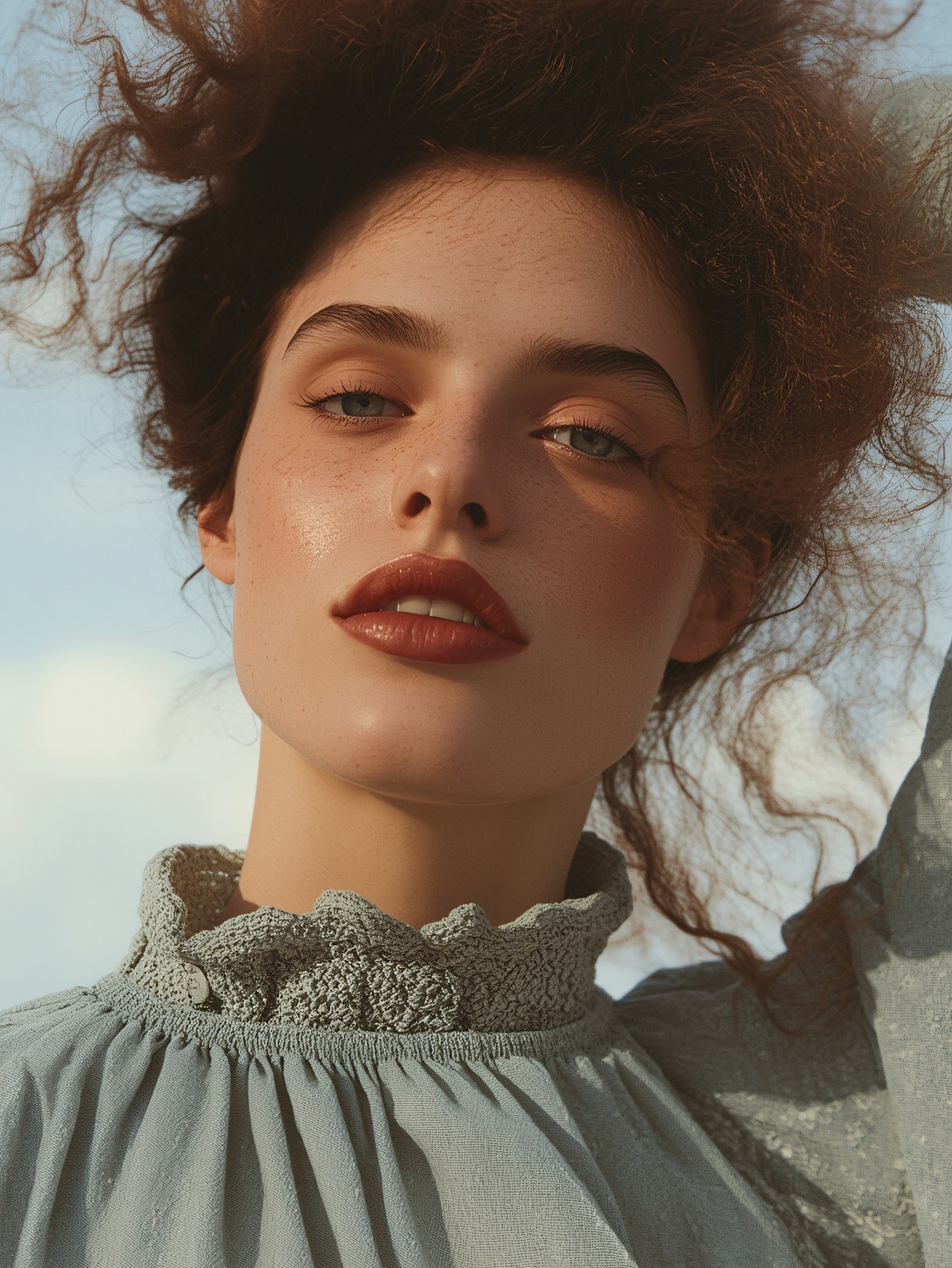 Close-up of a person with curly auburn hair, light blue blouse, and natural lighting against a clear sky background.
