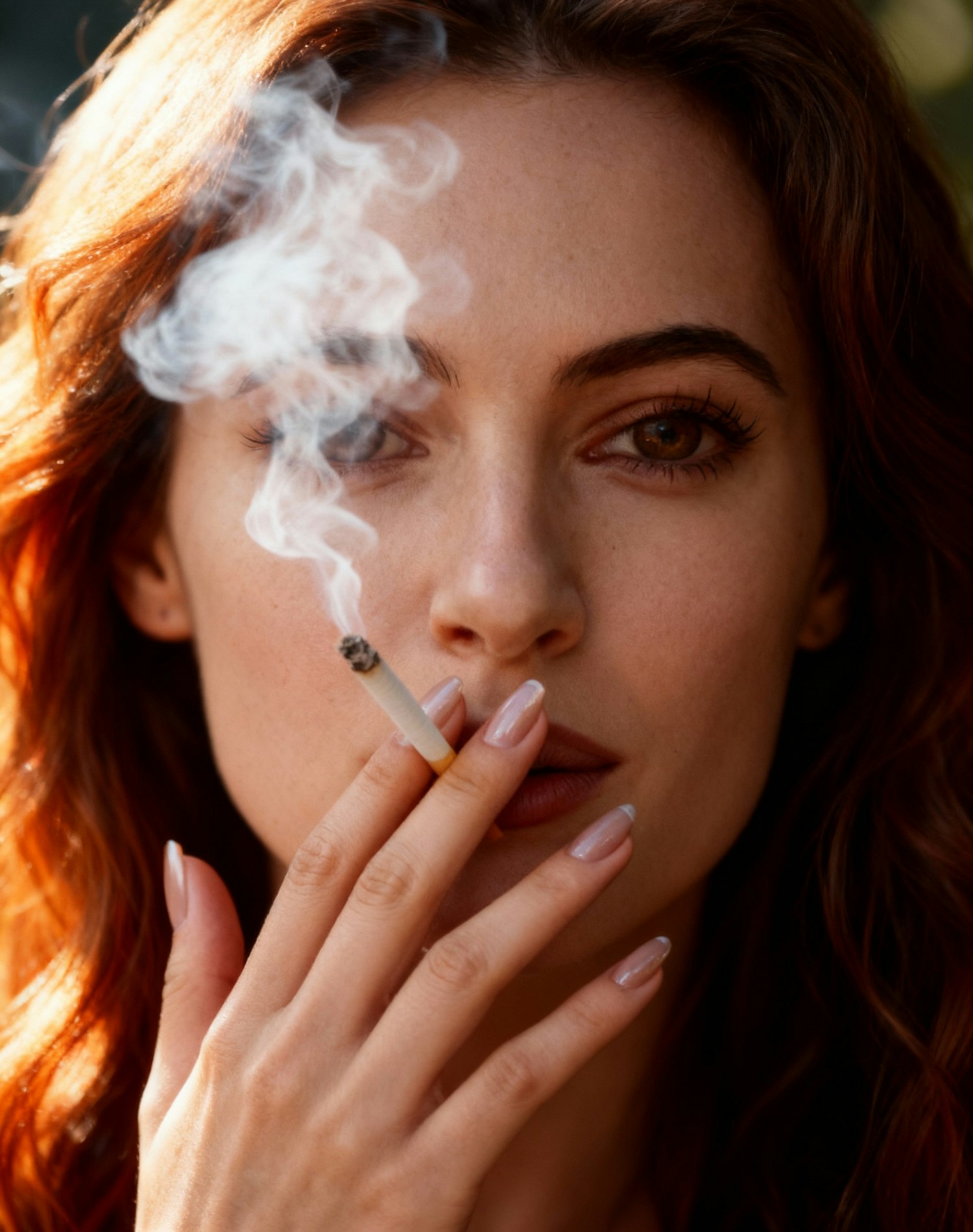 Close-up of a woman with auburn hair smoking a cigarette, with smoke curling upwards and a blurred background.