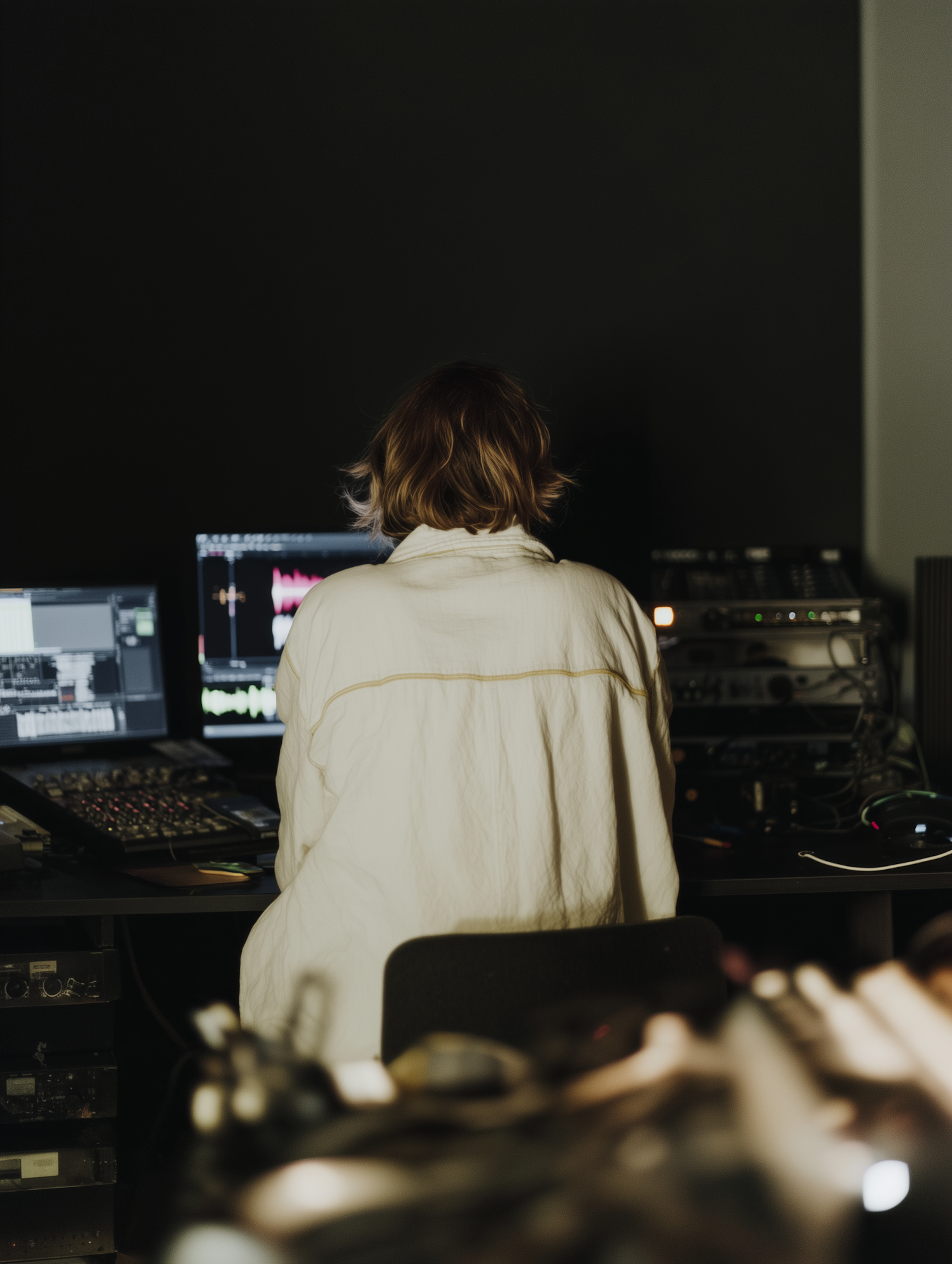 A person working on audio editing in a dimly lit studio, surrounded by professional equipment and glowing monitors.