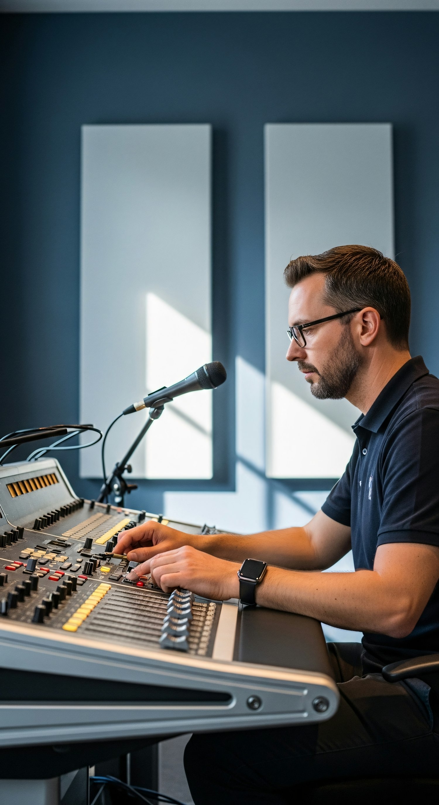 Man operating a professional audio mixing console in a studio, with a microphone and acoustic panels in the background.