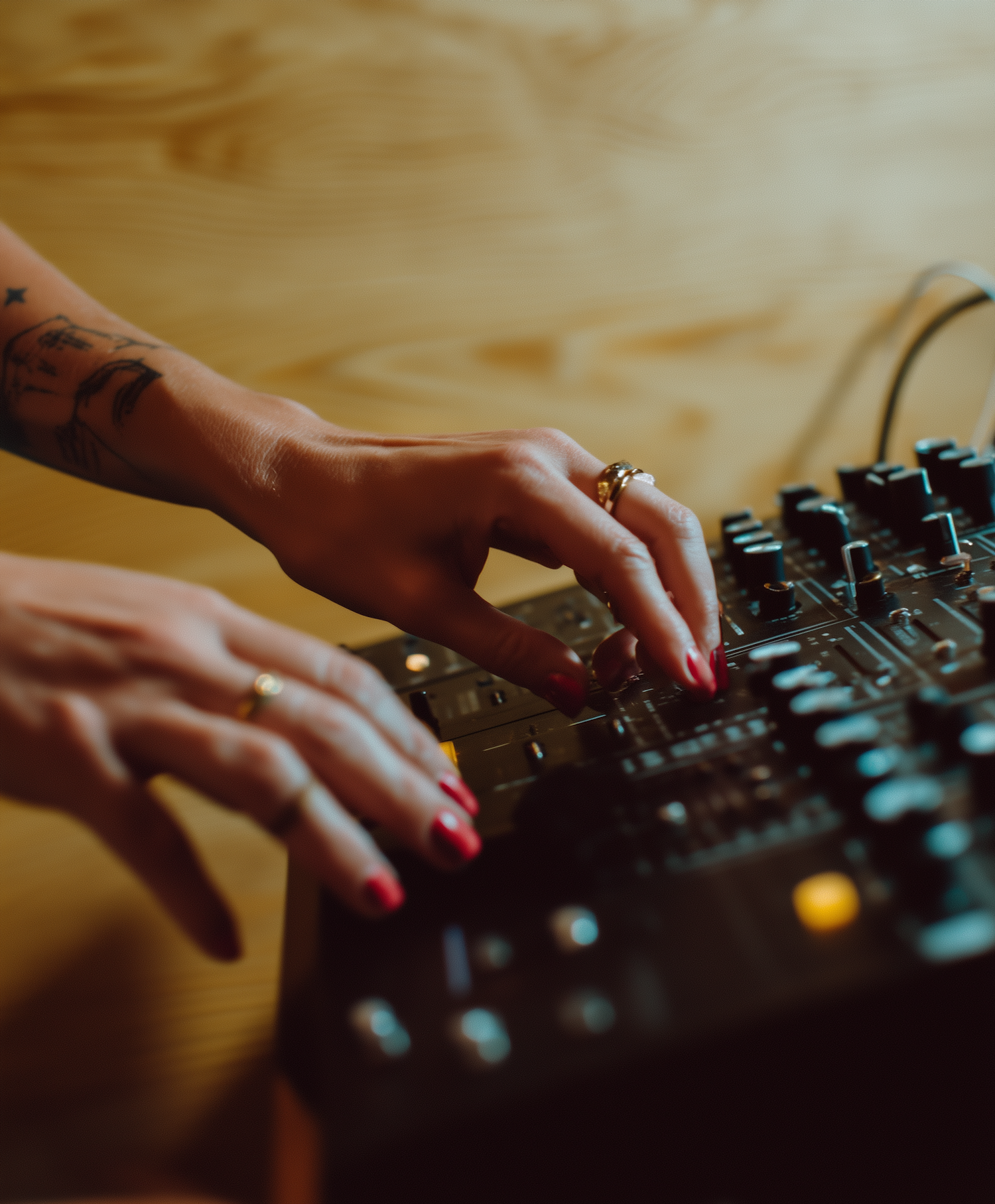 Close-up of hands adjusting controls on a professional audio mixer, with warm lighting and a blurred background for focus.
