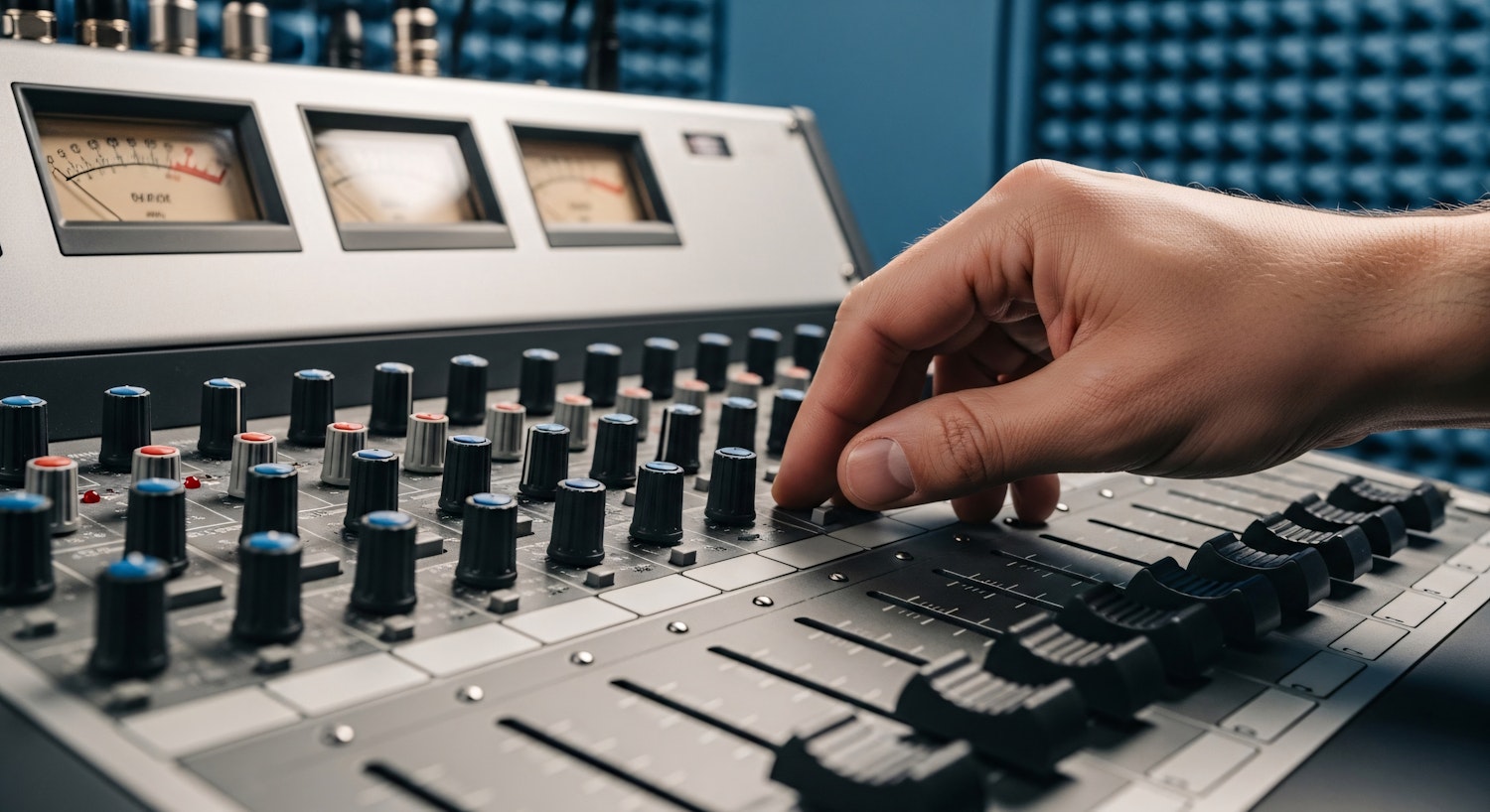 Close-up of a hand adjusting controls on a professional audio mixing console in a studio setting with soundproofing panels.