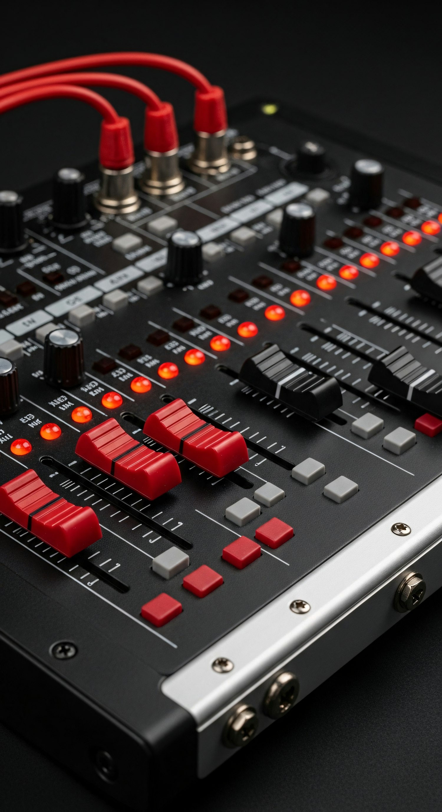 Close-up of a professional audio mixing console with red and black sliders, knobs, and glowing LED indicators, perfect for sound mixing.