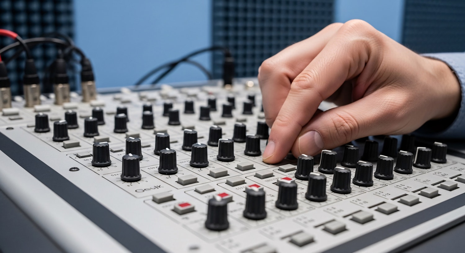 Close-up of a hand adjusting knobs on a professional audio mixing console in a studio setting, showcasing precision and control.