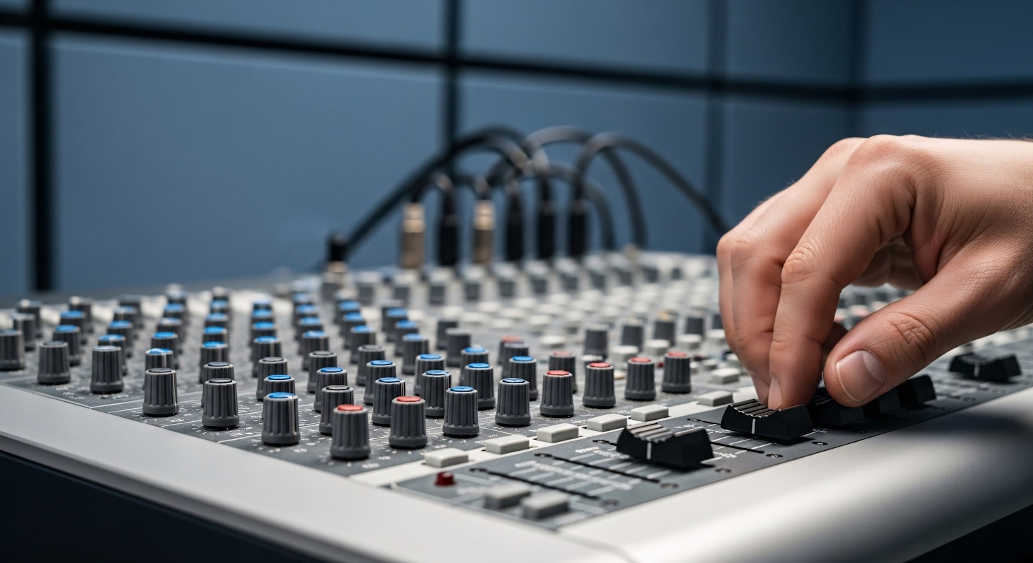 Close-up of a hand adjusting a slider on a professional audio mixing console in a modern studio setting.