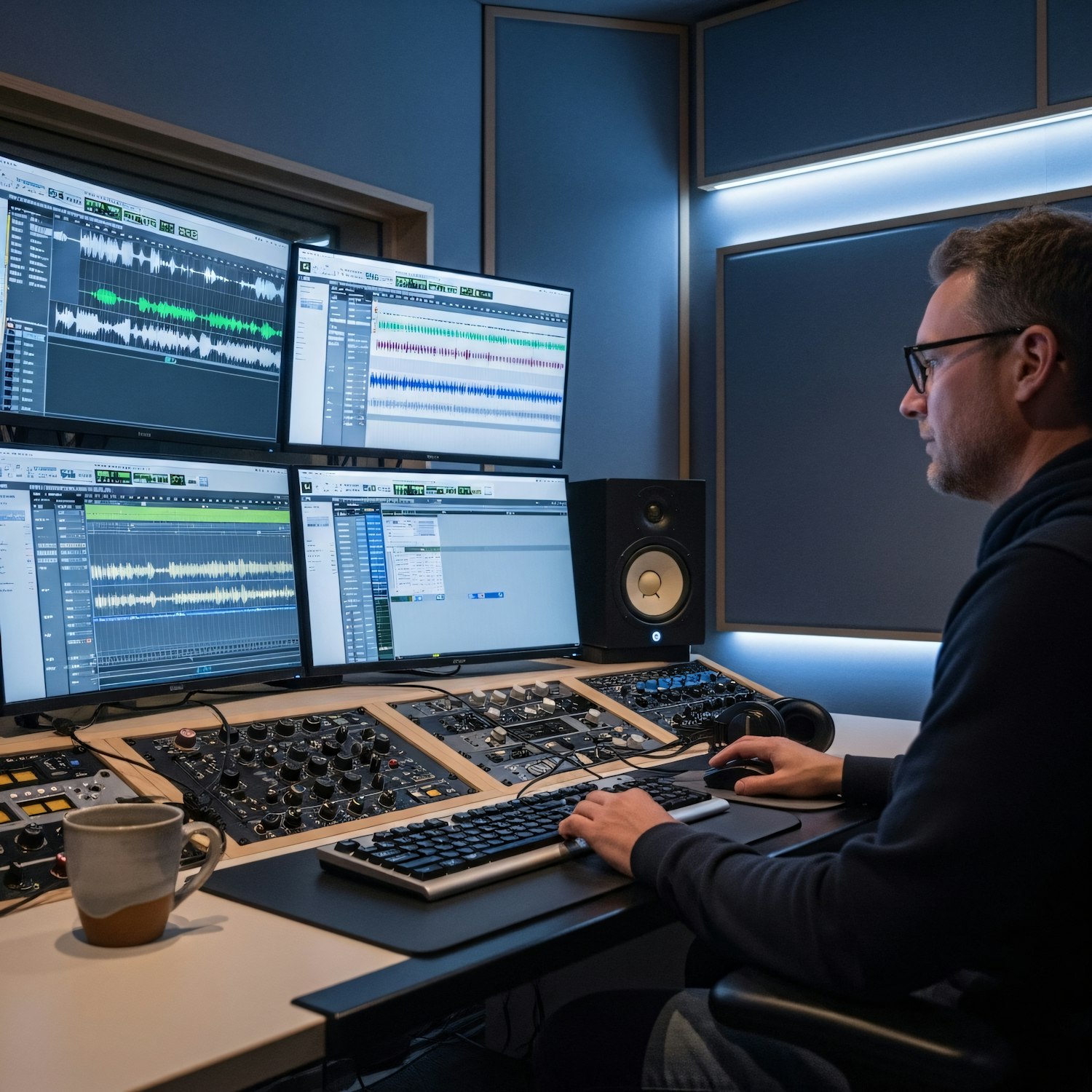 Audio engineer working in a professional studio with advanced equipment and multiple monitors displaying audio editing software.