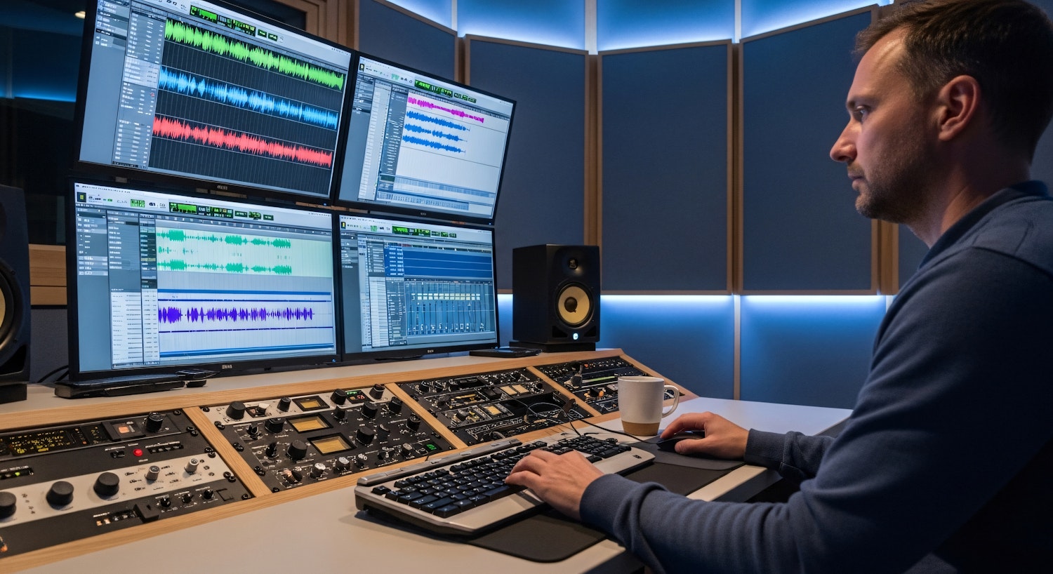 Audio engineer working in a professional studio, editing tracks on multiple monitors with advanced equipment and ambient lighting.