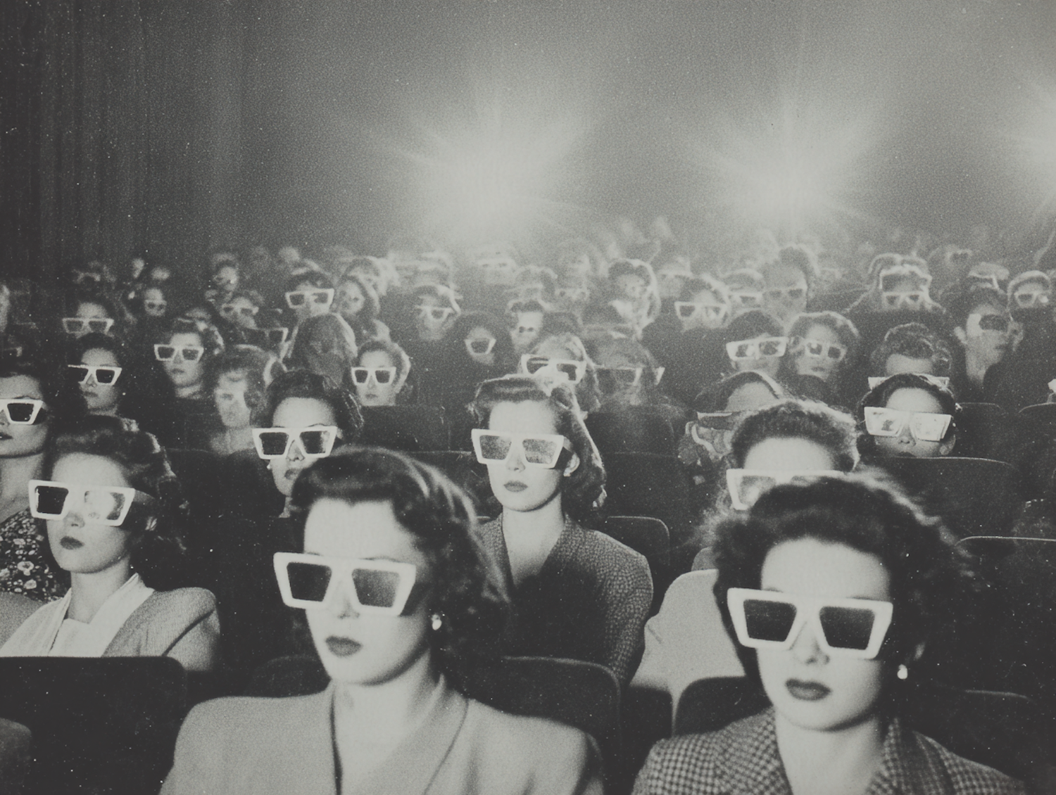 Audience in a vintage theater wearing unique 3D glasses, creating a glimpse of cinema history and the technology of the past.