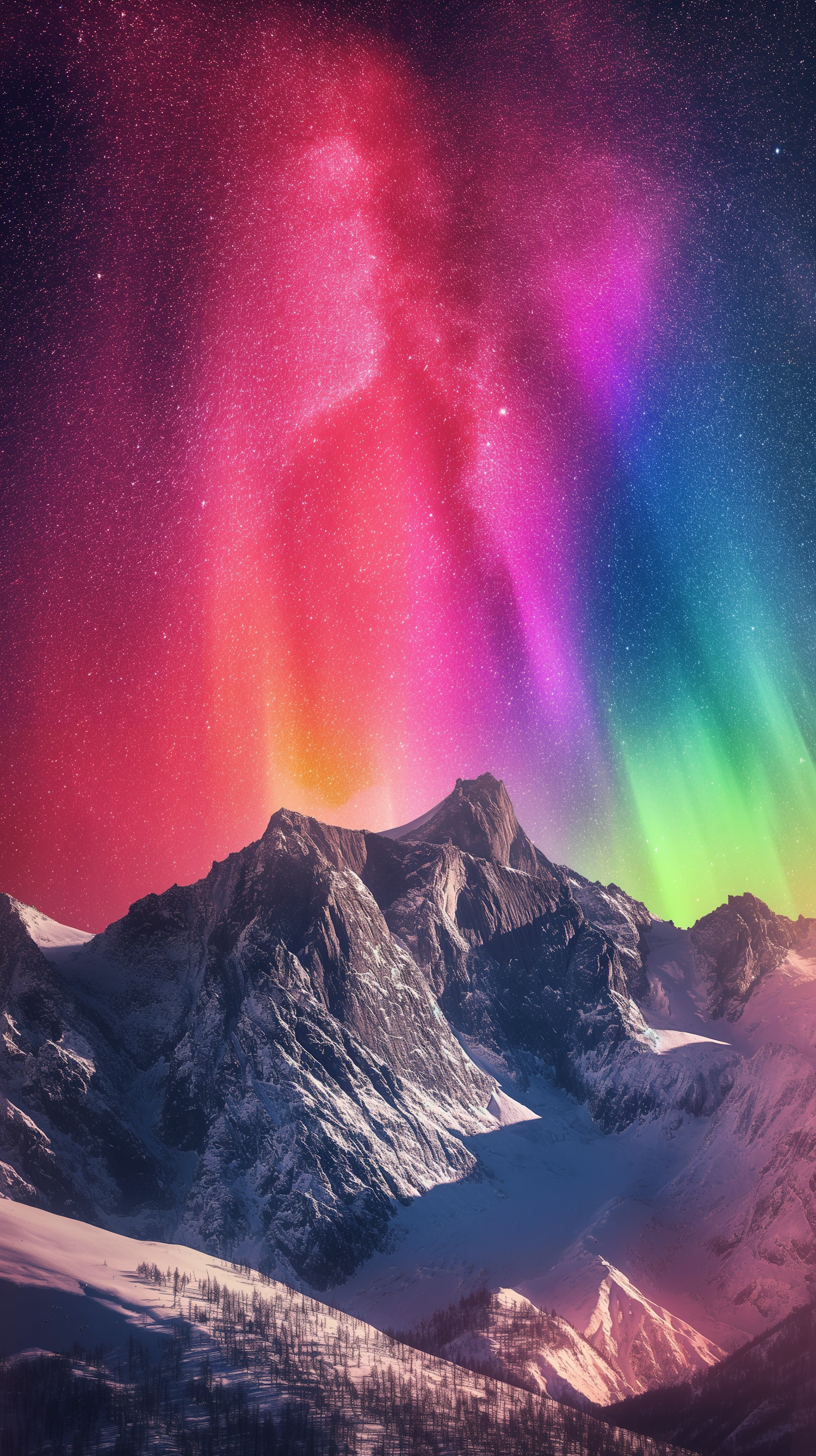 Vibrant aurora borealis over snow-capped mountains, with a starry night sky creating a breathtaking and colorful natural spectacle.