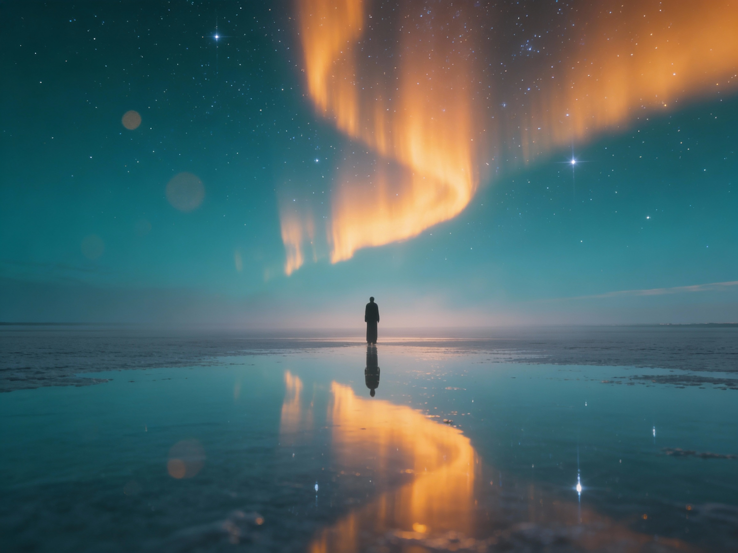 A person stands on a reflective surface under a vibrant aurora borealis, with green and orange lights illuminating the starry night sky.
