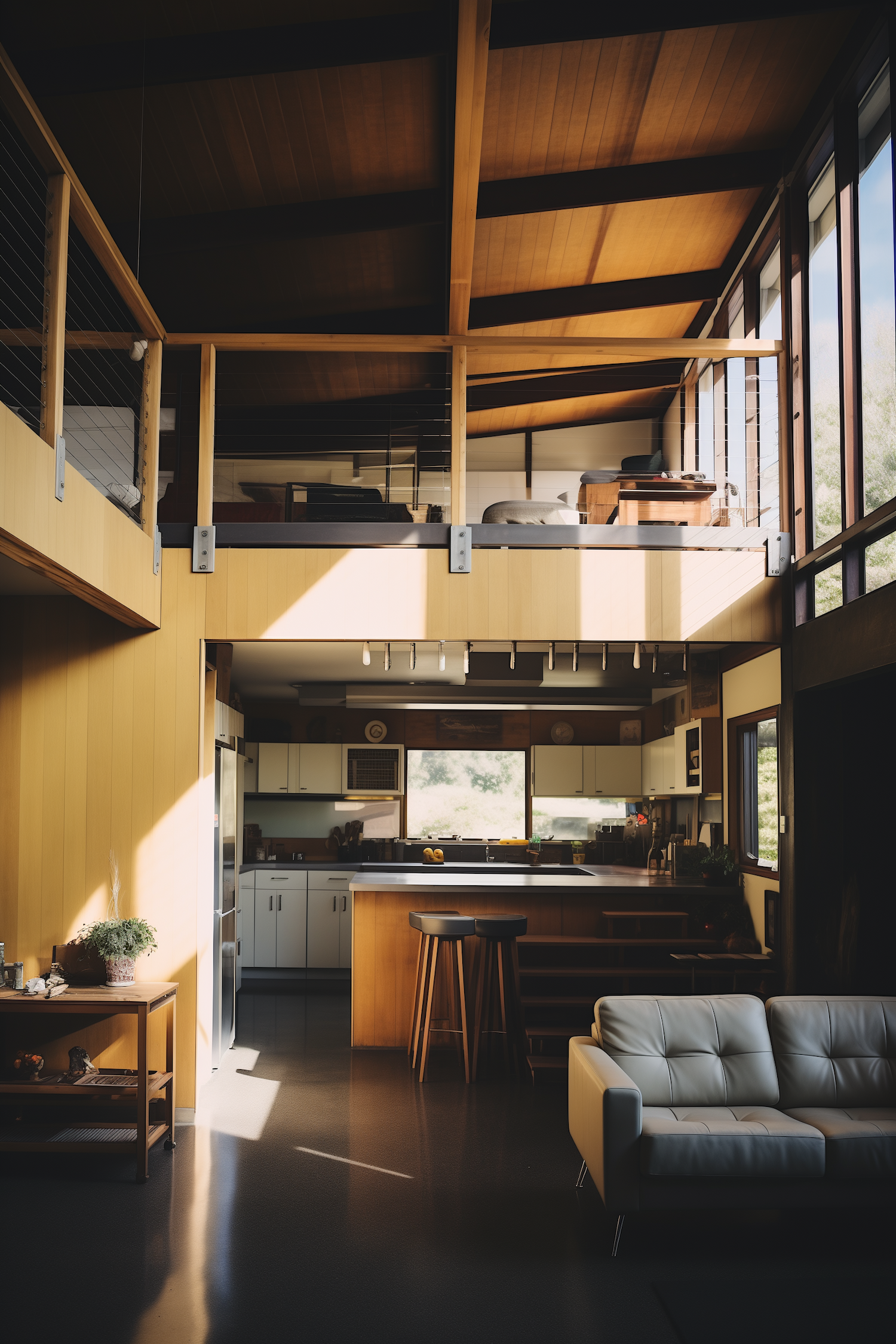 Modern open-concept living space with mezzanine, sleek kitchen, and large windows. Warm wood tones and natural light create a cozy atmosphere.