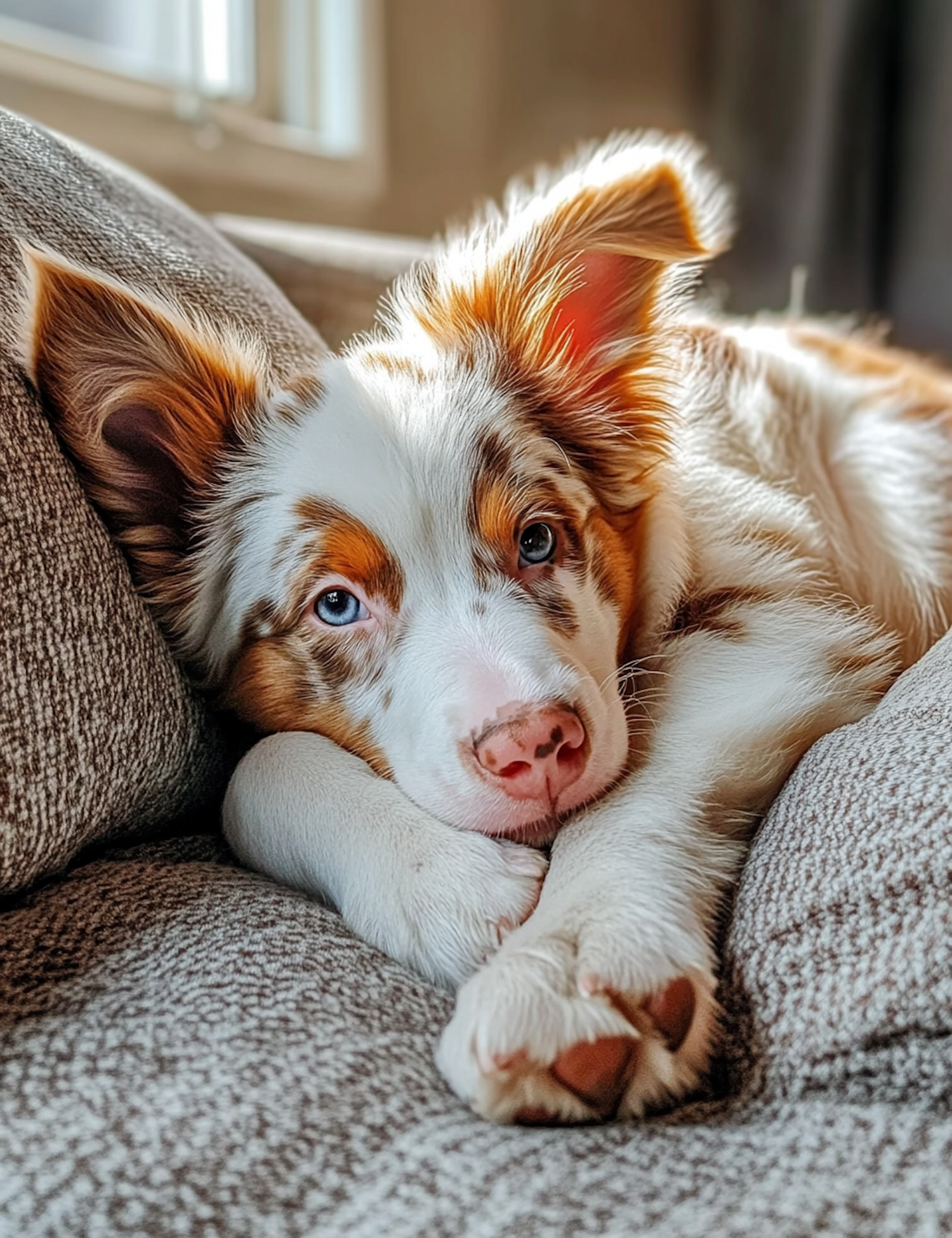 Adorable puppy with blue eyes and fluffy fur relaxing on a cozy gray couch in warm sunlight.