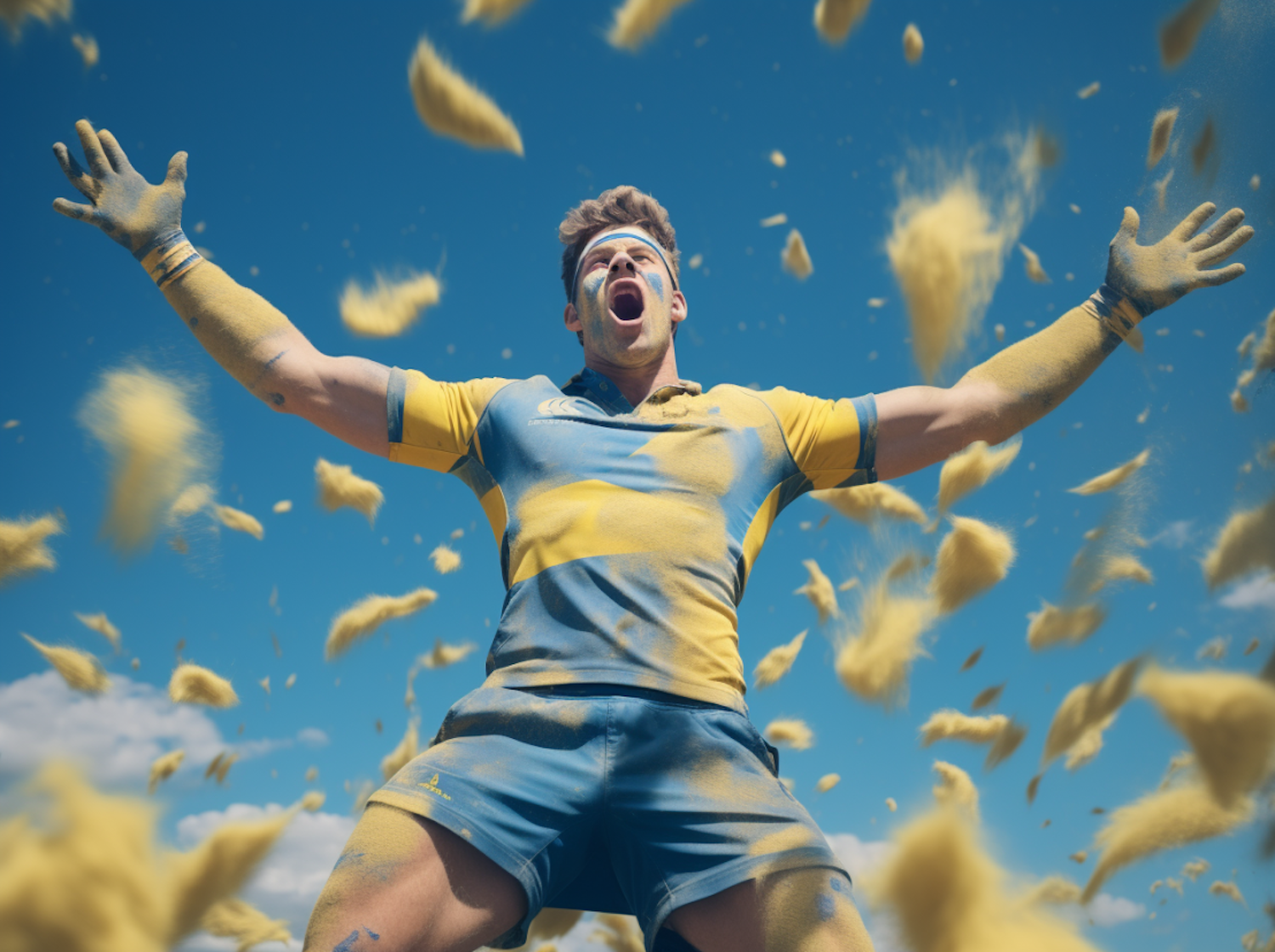 Athlete in blue and yellow uniform celebrates with arms raised, surrounded by floating yellow powder against a clear blue sky.