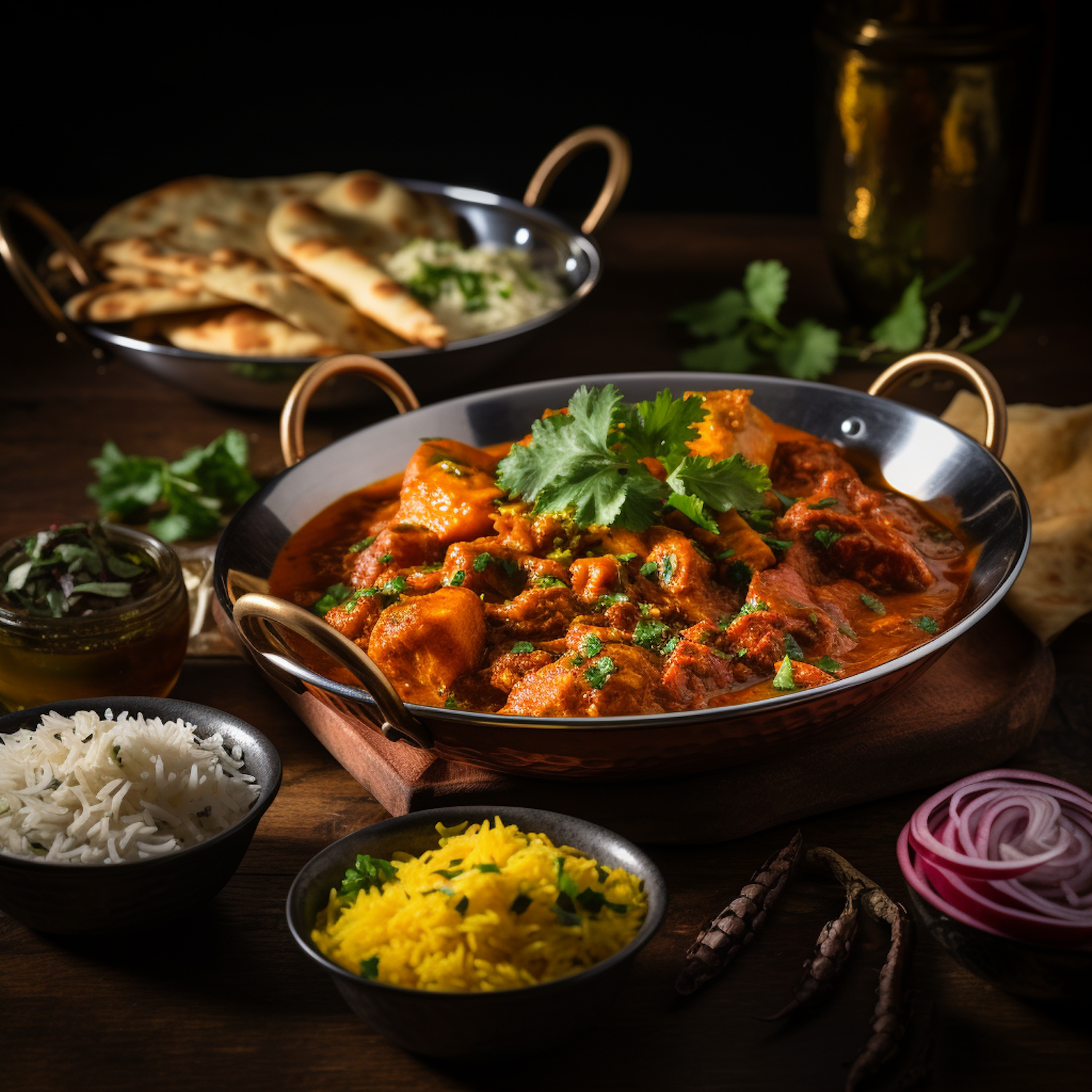 Delicious Indian curry with naan, basmati rice, and vibrant garnishes on a rustic table setting.