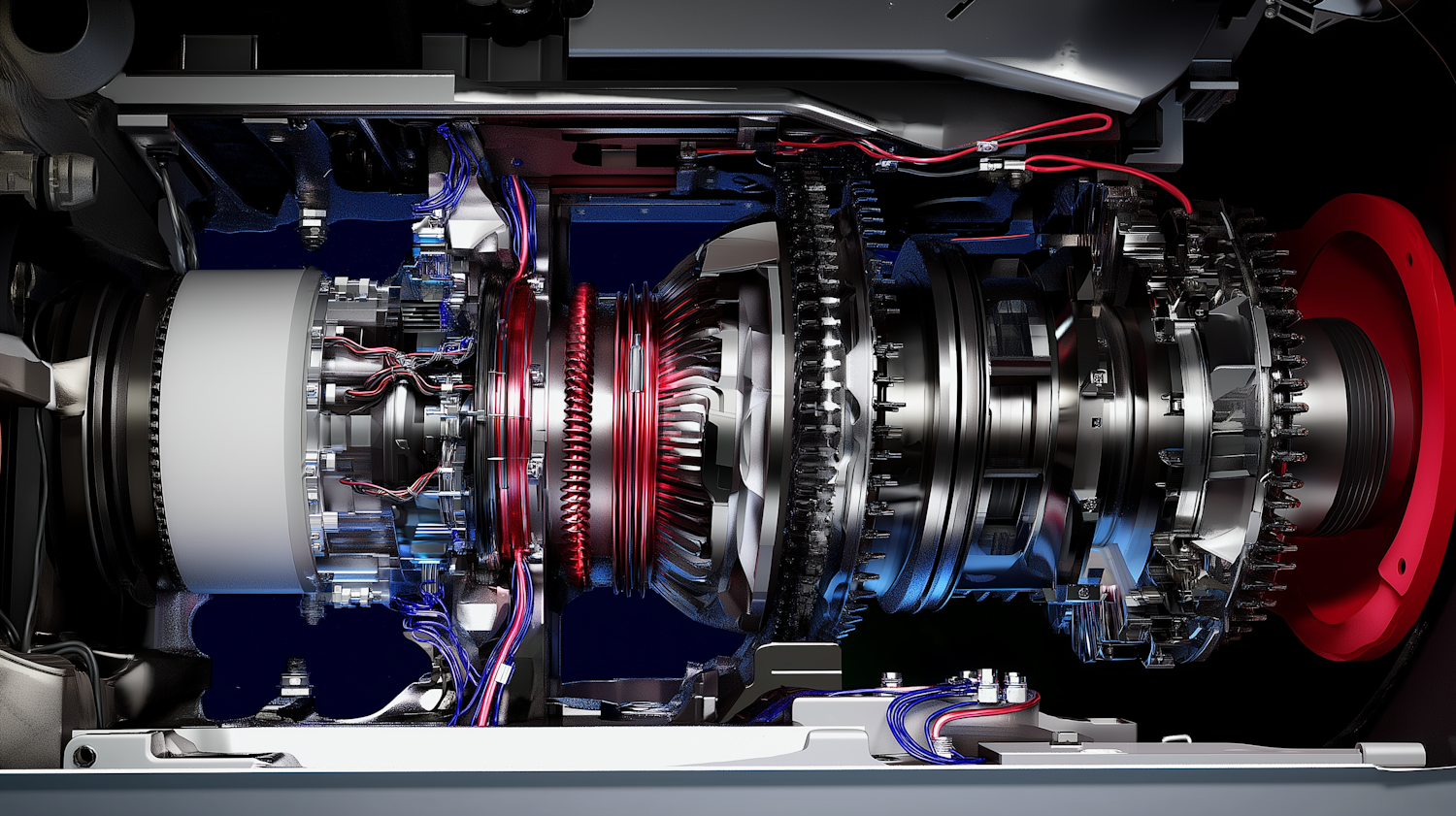 Detailed cross-section of a high-performance automotive transmission system with intricate gears, wiring, and vibrant red and blue accents.