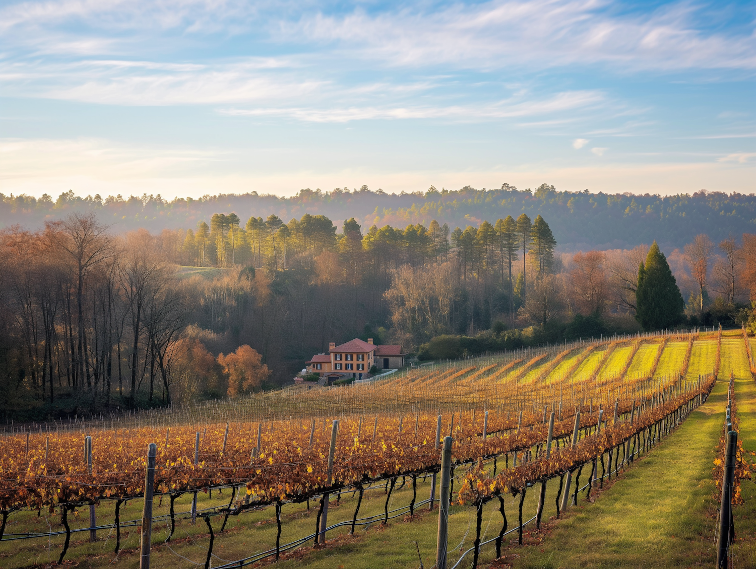 Scenic vineyard with autumn foliage, a rustic house, and a forest backdrop under a clear blue sky.