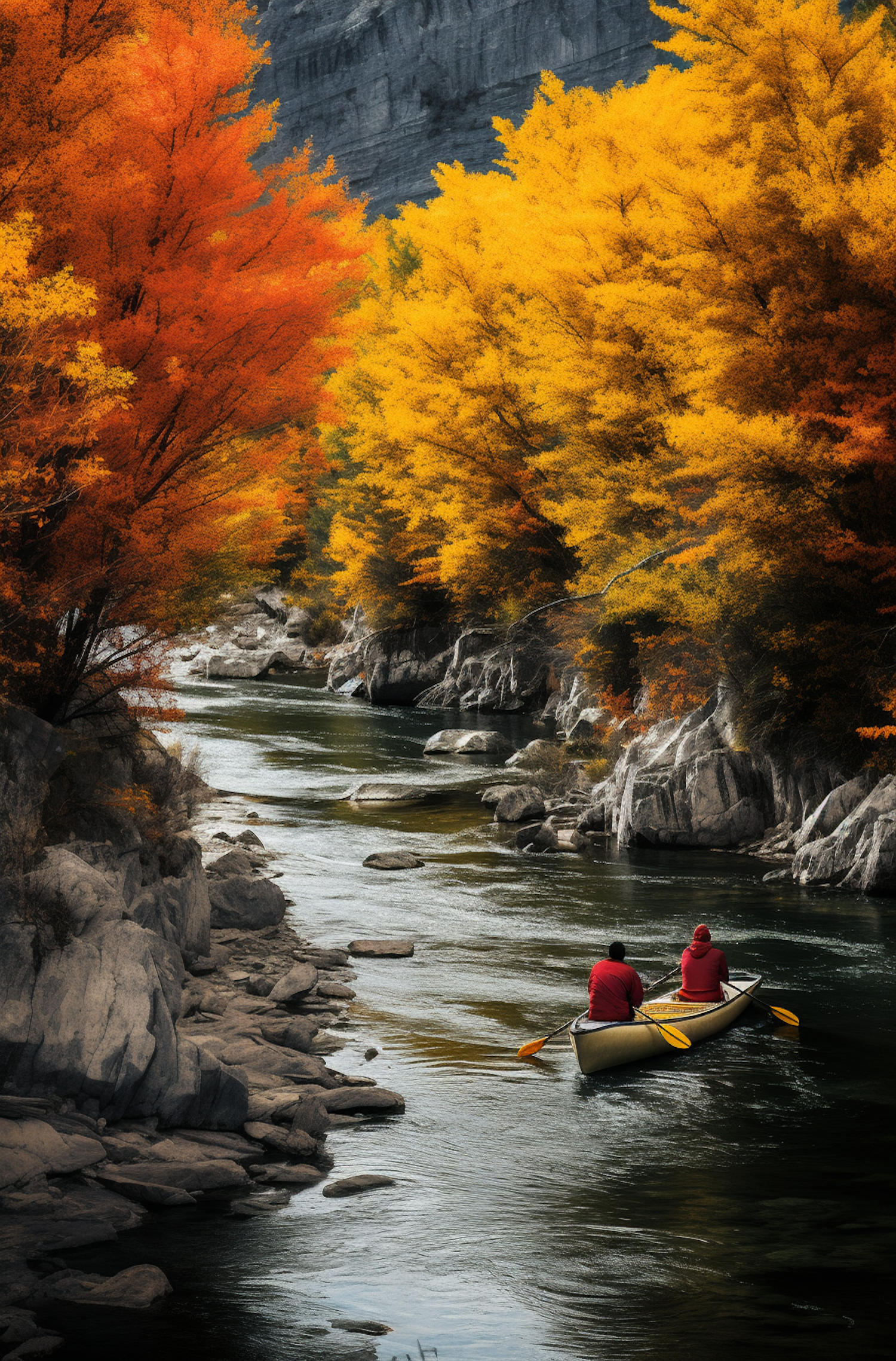 Canoeists paddle through a serene autumn river, surrounded by vibrant orange and yellow foliage.
