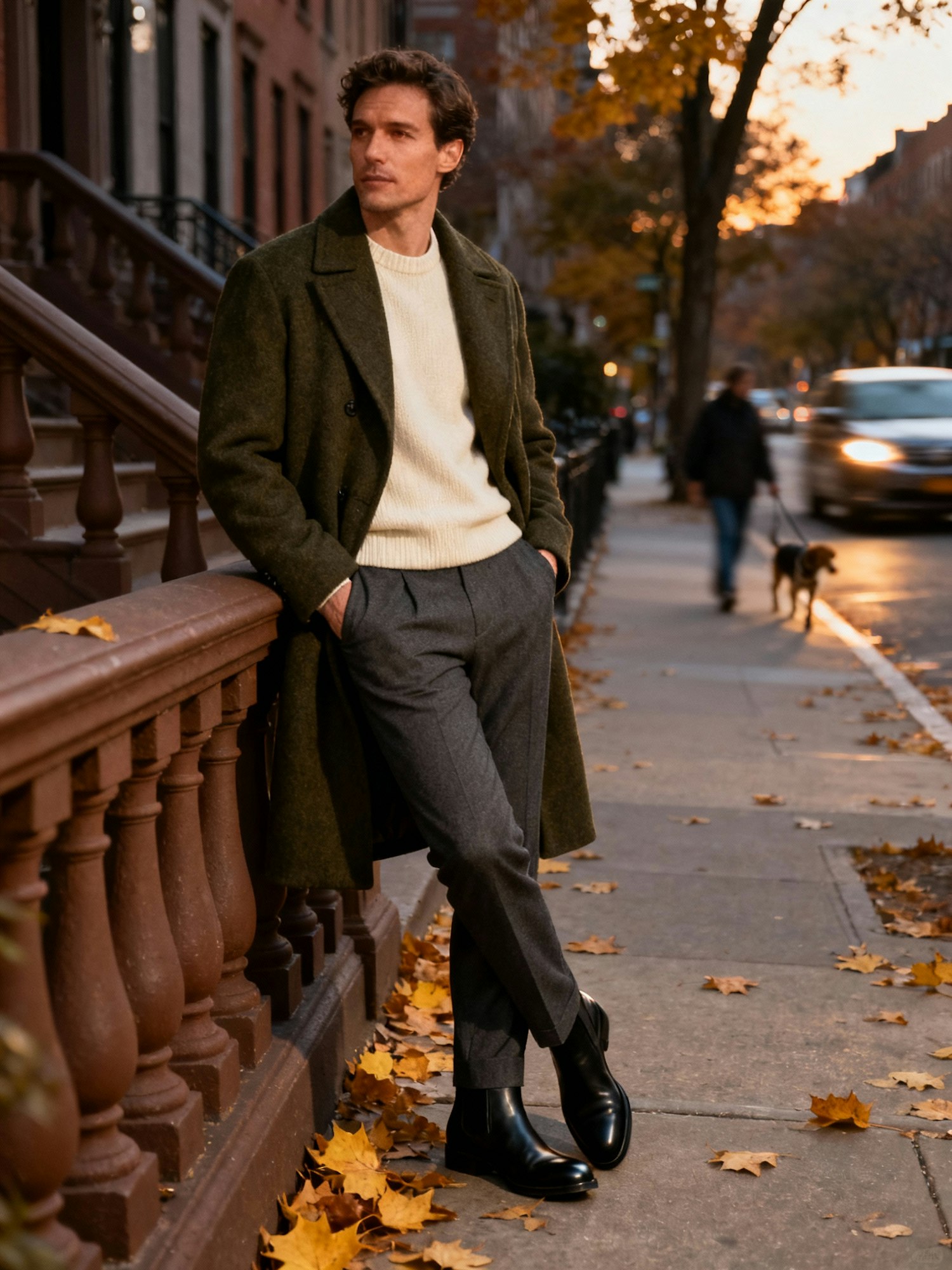 A realistic street-photography fashion image captured 'across the street' in New York City, fall 2025, at dusk. The scene unfolds along a quiet block of the West Village where golden leaves scatter across the sidewalk. A man leans against a brownstone railing, one hand in the pocket of his dark olive overcoat cut from heavy wool, layered over a cream cashmere crewneck and pressed slate trousers. He wears simple black leather Chelsea boots that catch the last shimmer of evening light. Shot at eye-level with a 50 mm lens, f / 2.4, the focus lingers gently on his thoughtful expression while the street behind softens into motion blur—a car passing, someone walking a dog. The color temperature sits in natural daylight with a hint of amber warmth. The mood is restrained confidence, a study in understated elegance and the stillness of fall twilight.