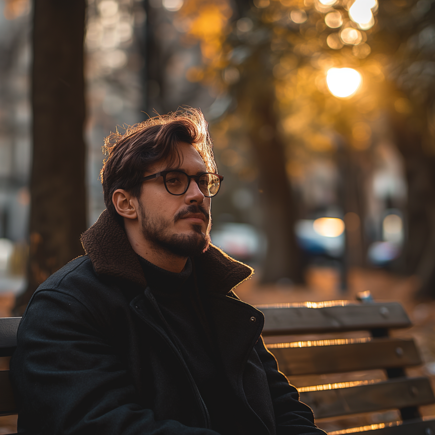 Stylish man with glasses and beard sitting on a bench during golden hour in a park, surrounded by warm autumn light and blurred trees.