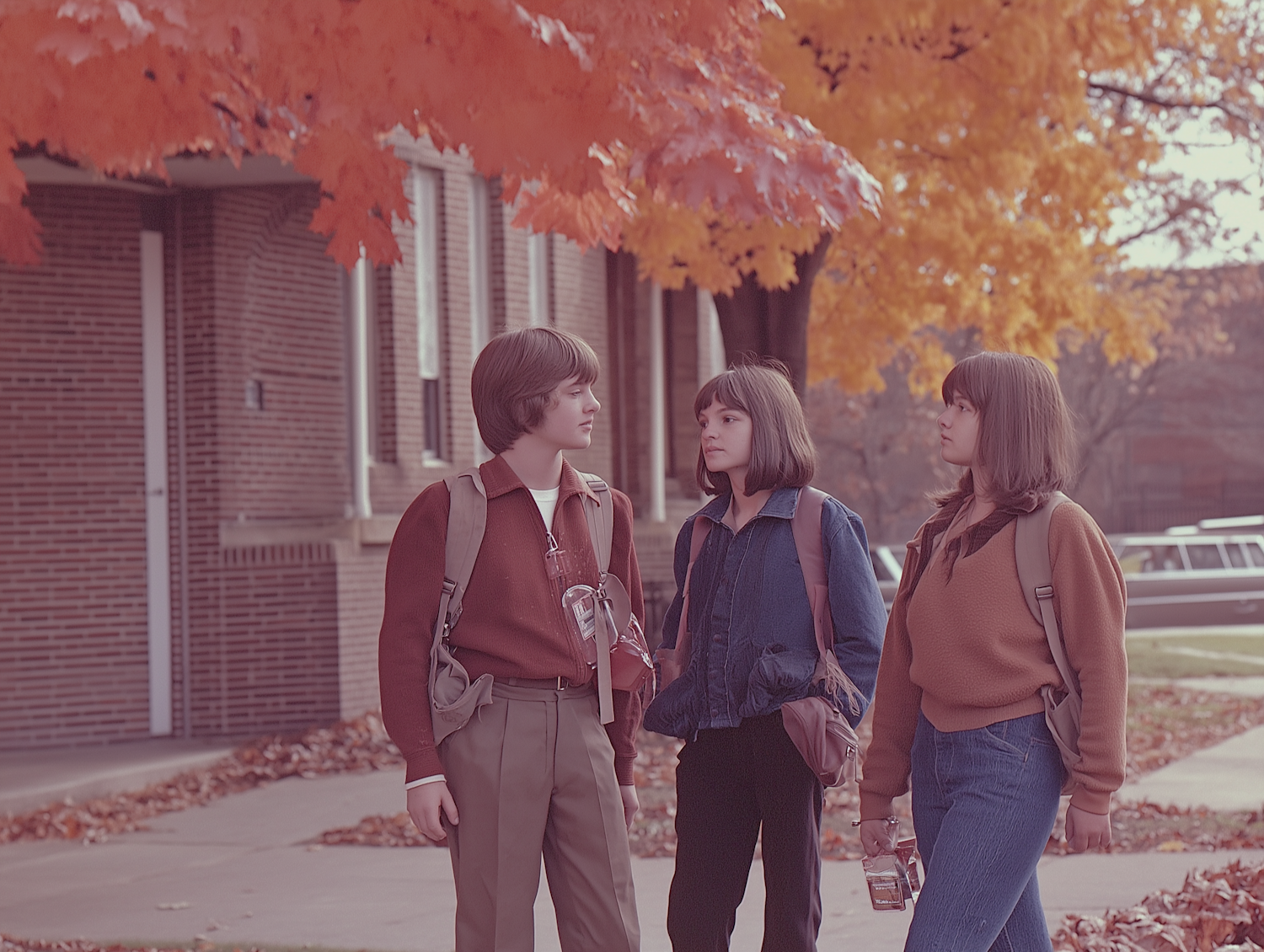 Three young friends chat under autumn leaves, wearing casual outfits with backpacks, in a school setting with vibrant orange foliage.