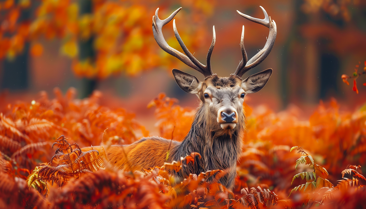 Majestic stag with impressive antlers in a vibrant autumn forest, surrounded by fiery orange and red foliage.