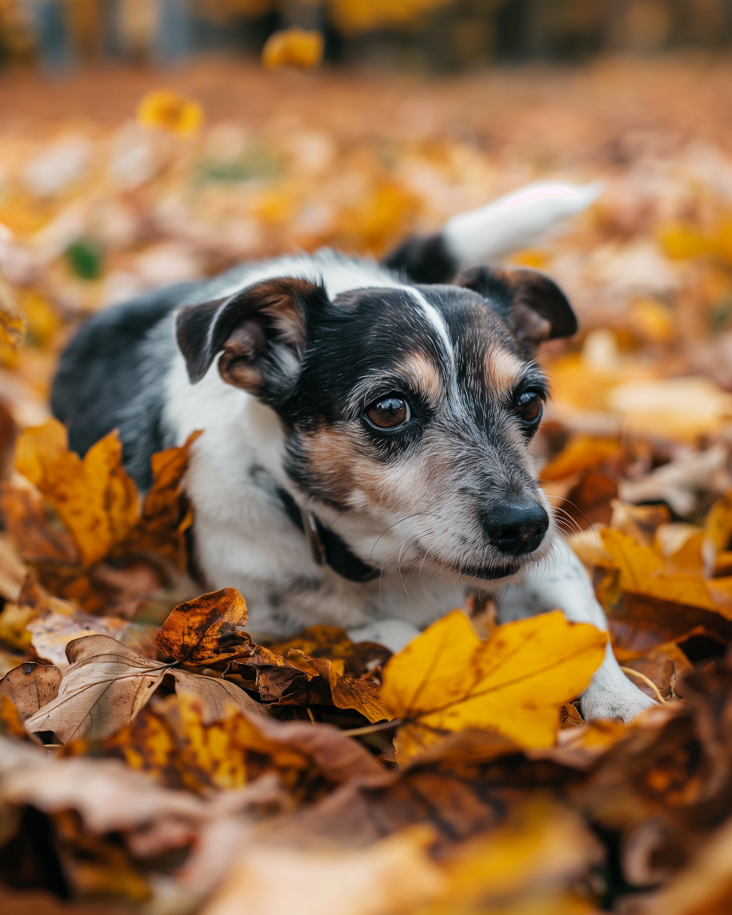 Adorable dog nestled in vibrant autumn leaves, capturing the essence of fall with warm colors and a curious gaze.