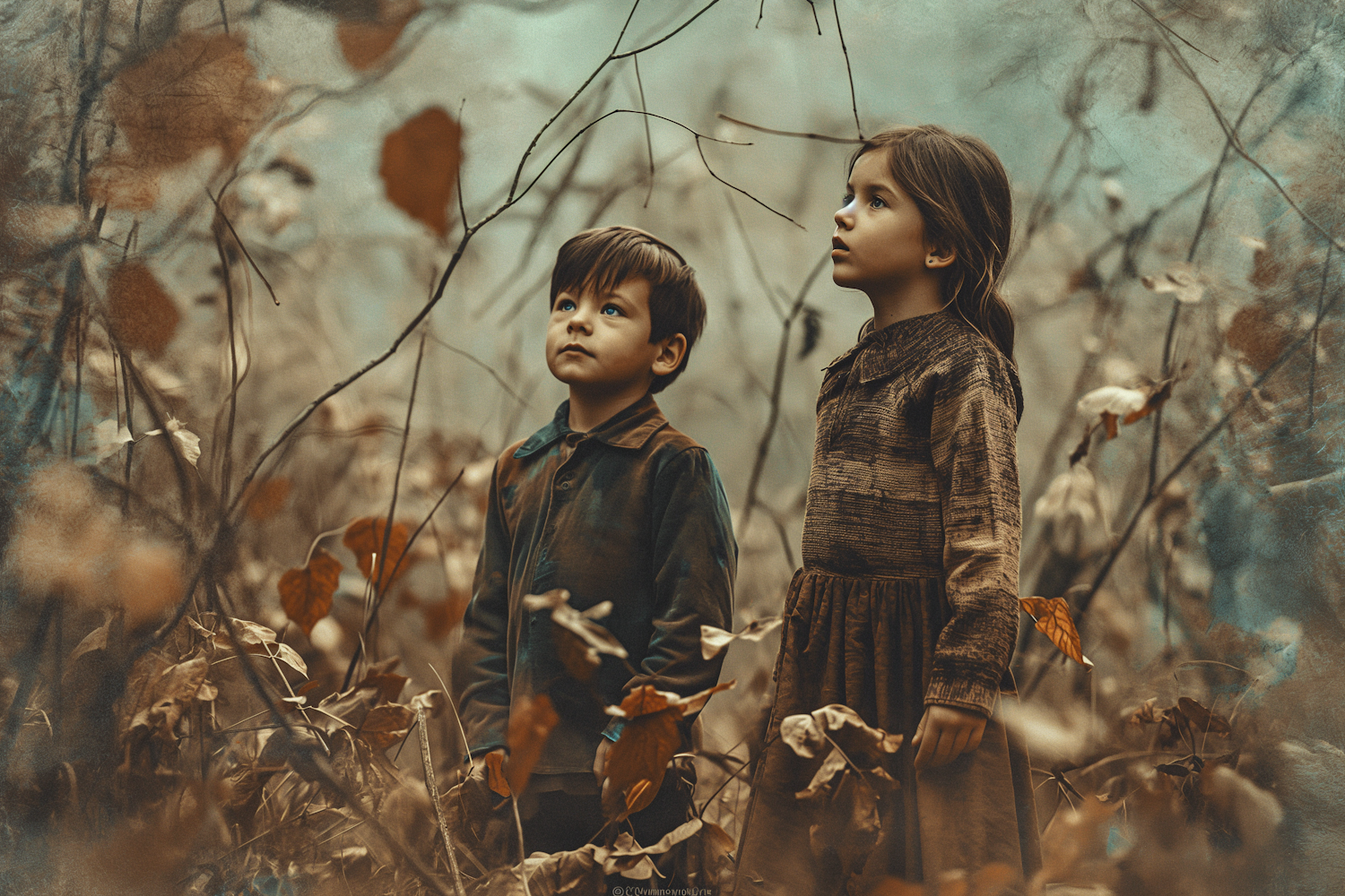 Two children in vintage attire stand in a sepia-toned forest, gazing upwards with wonder and curiosity.