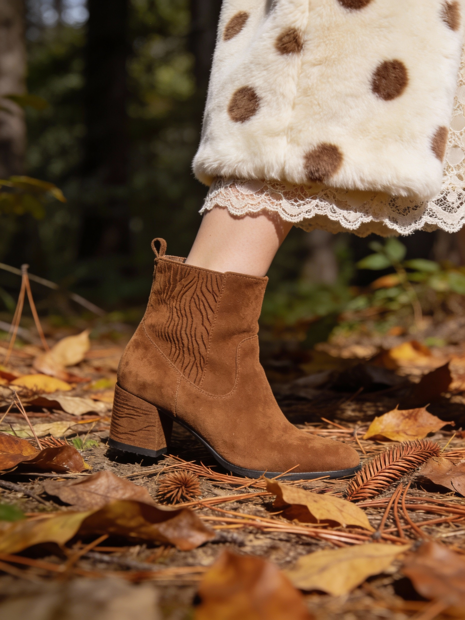 Accessory-focused editorial shot of cocoa-brown suede ankle boots stepping on dry leaves and pine needles, hem of a cream spotted plush coat visible at the edge, a hint of lace skirt, soft forest shadows, crisp detail on suede grain and leaf textures, modern fashion composition. ultra-HD 4K fashion editorial photography, razor-sharp focus, extreme detail, modern luxury styling, clean composition, high dynamic range, crisp textures, premium magazine quality, contemporary fashion aesthetic, no grain, no blur, no vintage