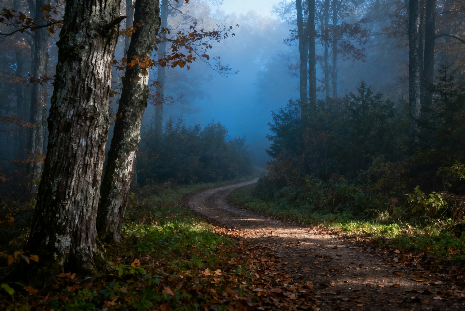 A misty forest path surrounded by autumn trees and fallen leaves, creating a serene and mysterious atmosphere.