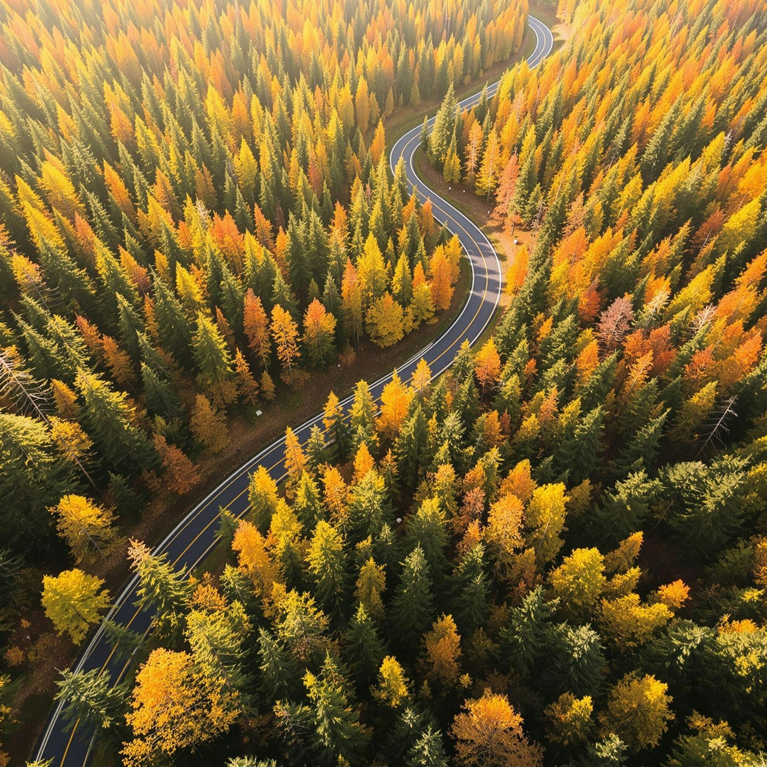 Aerial view of a winding road through a vibrant autumn forest with green, yellow, and orange trees under warm sunlight.