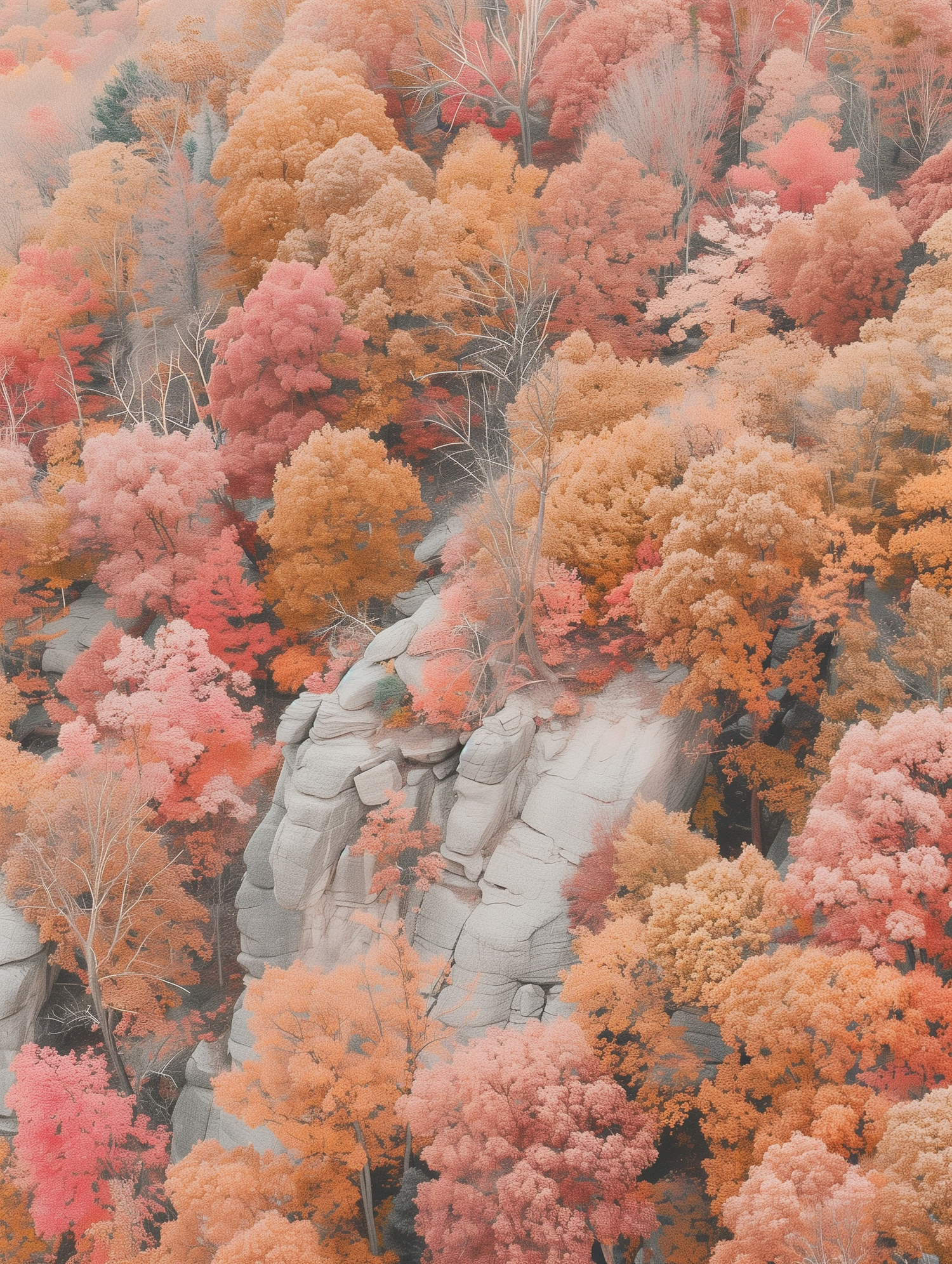 A stunning autumn forest with vibrant orange and red foliage surrounding a rocky outcrop, showcasing nature's beauty in fall.