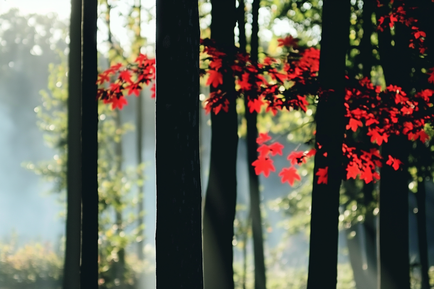 Vibrant red leaves contrast against dark tree trunks in a serene, sunlit forest setting with a misty background.