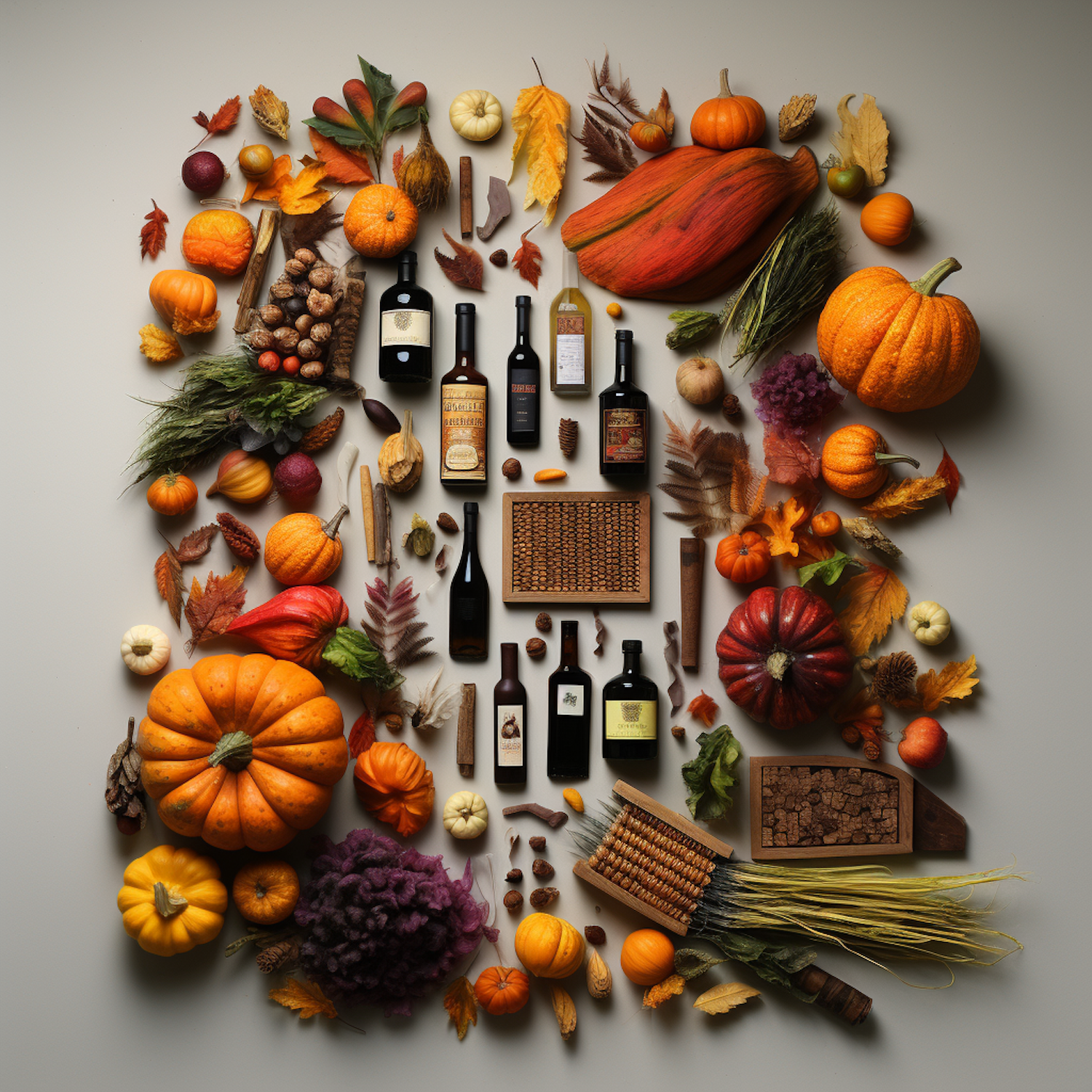 Autumn-themed flat lay with pumpkins, wine bottles, and fall leaves, creating a warm and rustic harvest display.