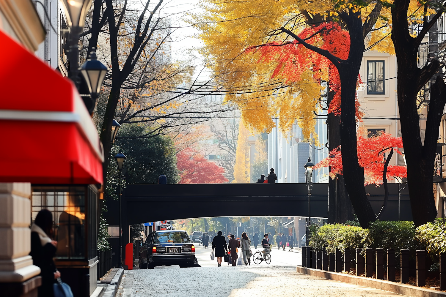 Vibrant urban street scene with autumn foliage, people walking and cycling, and a classic car on a cobblestone road.