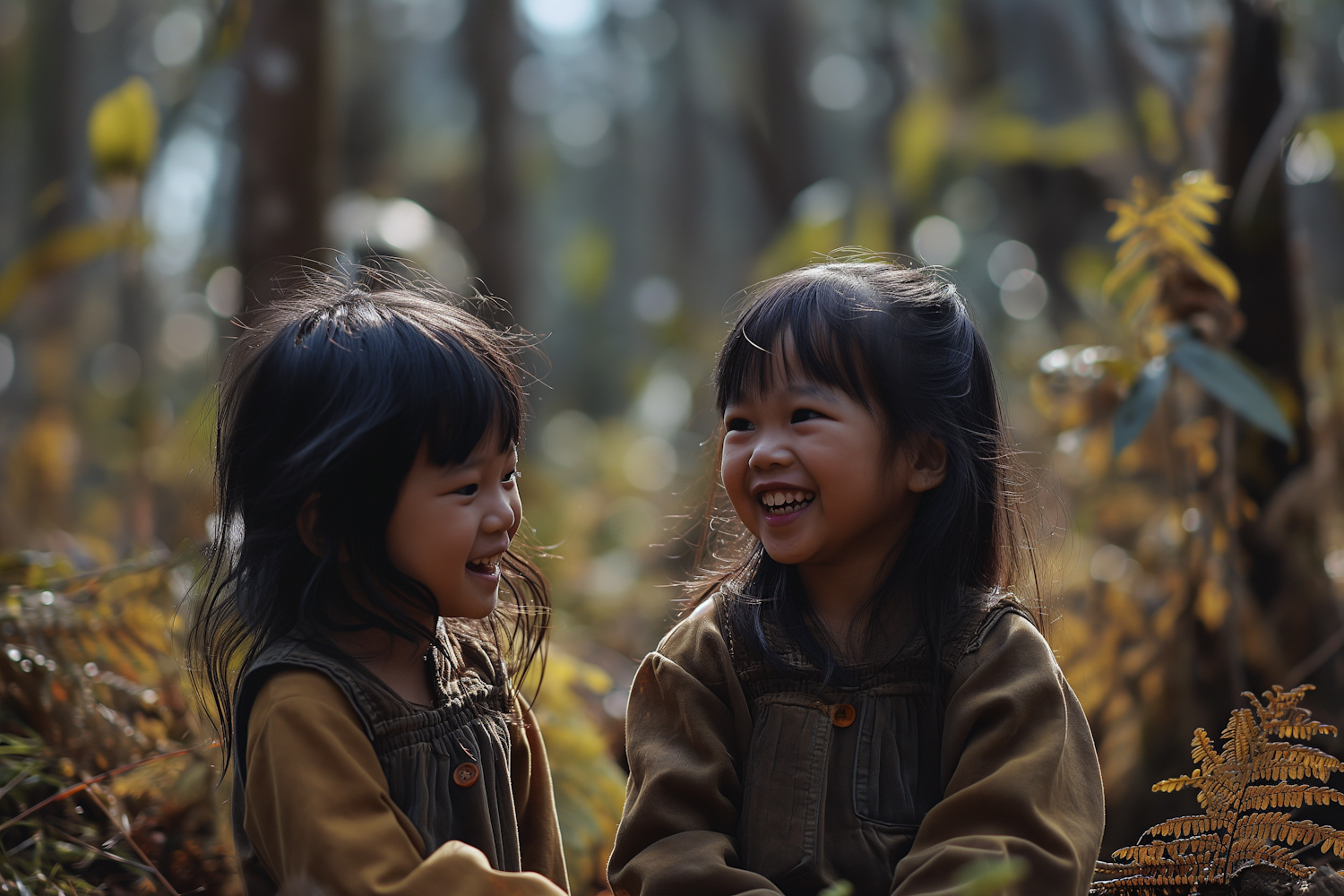 Two young girls laughing together in a sunlit forest, wearing brown overalls, surrounded by autumn foliage.