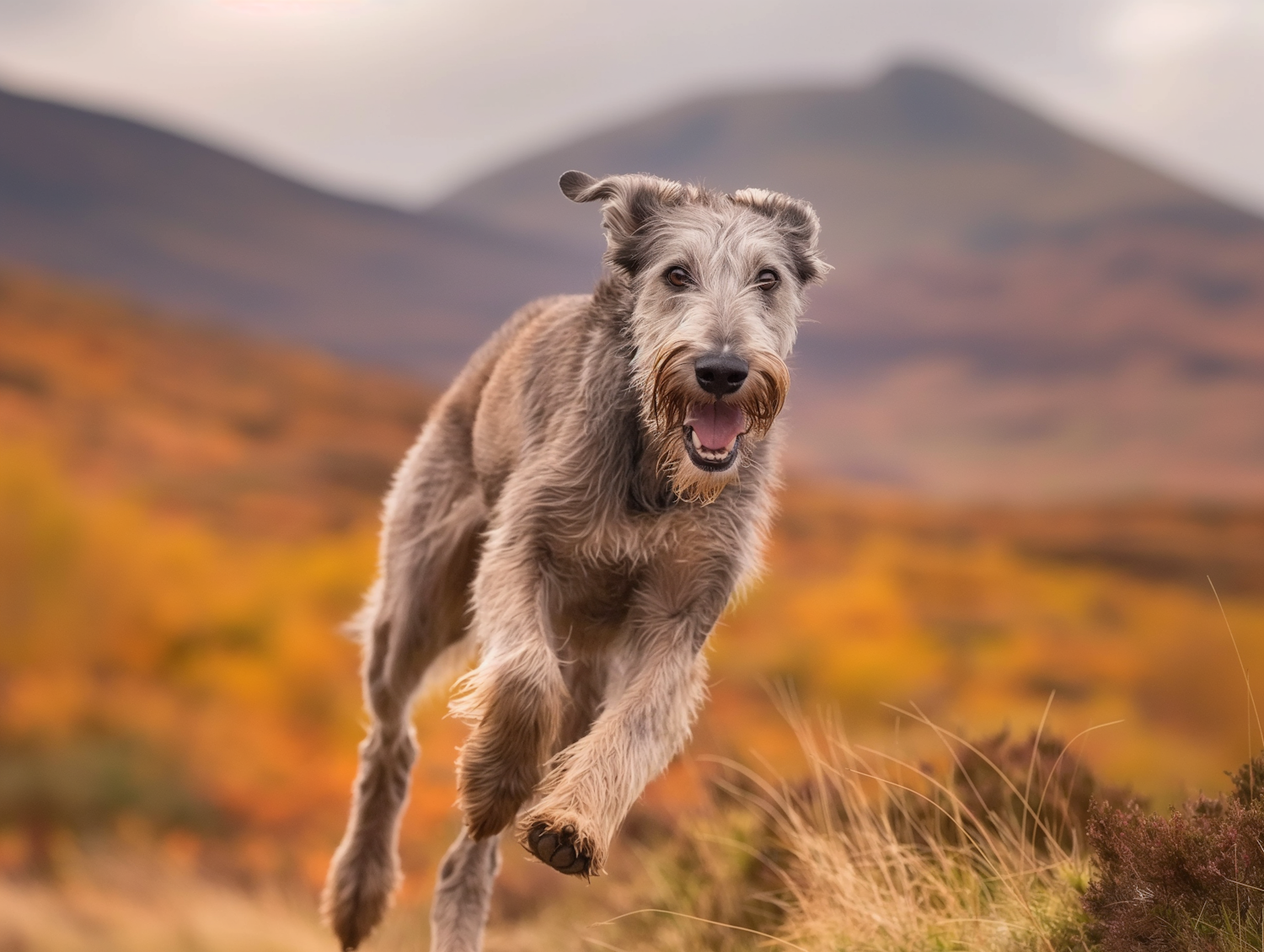 A joyful grey dog runs through a vibrant autumn landscape with hills and colorful foliage in the background.
