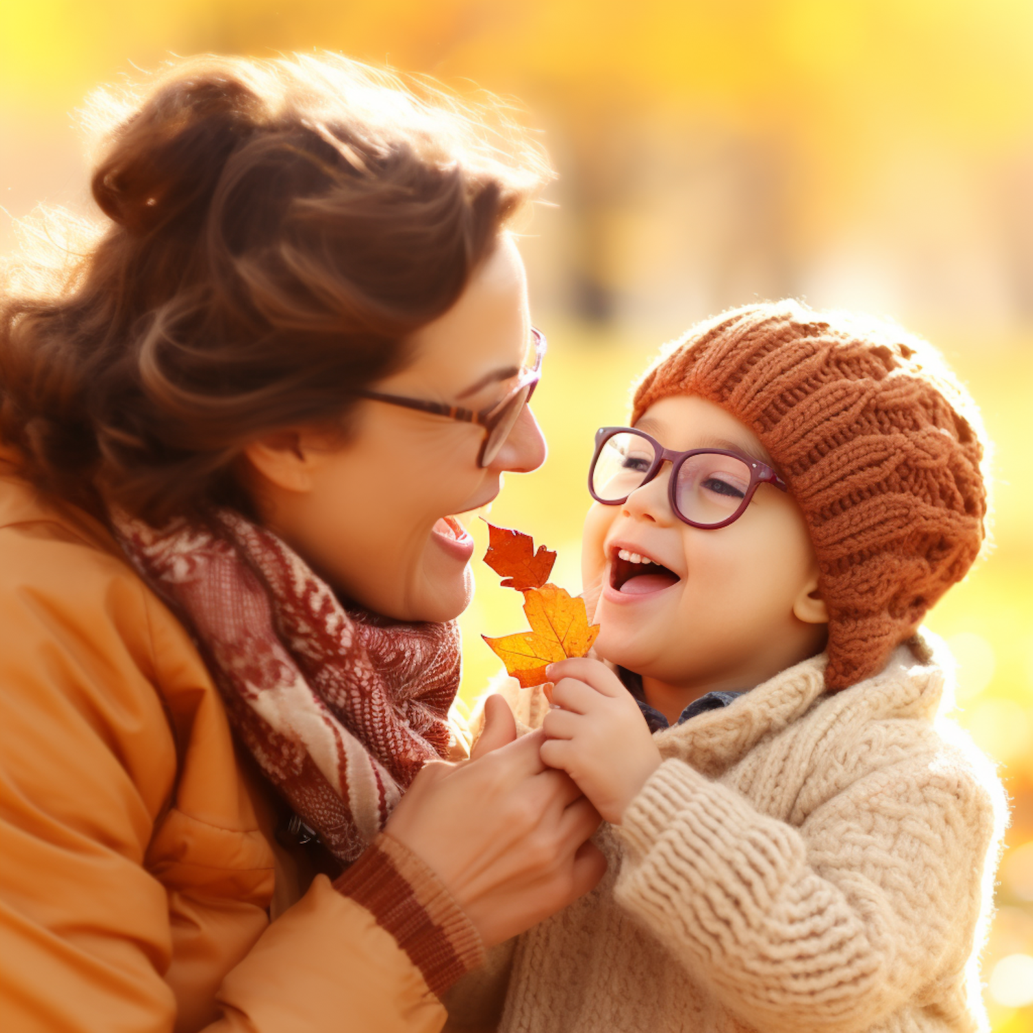 Mother and child share a joyful moment with autumn leaves, dressed warmly in cozy fall attire, surrounded by golden hues.